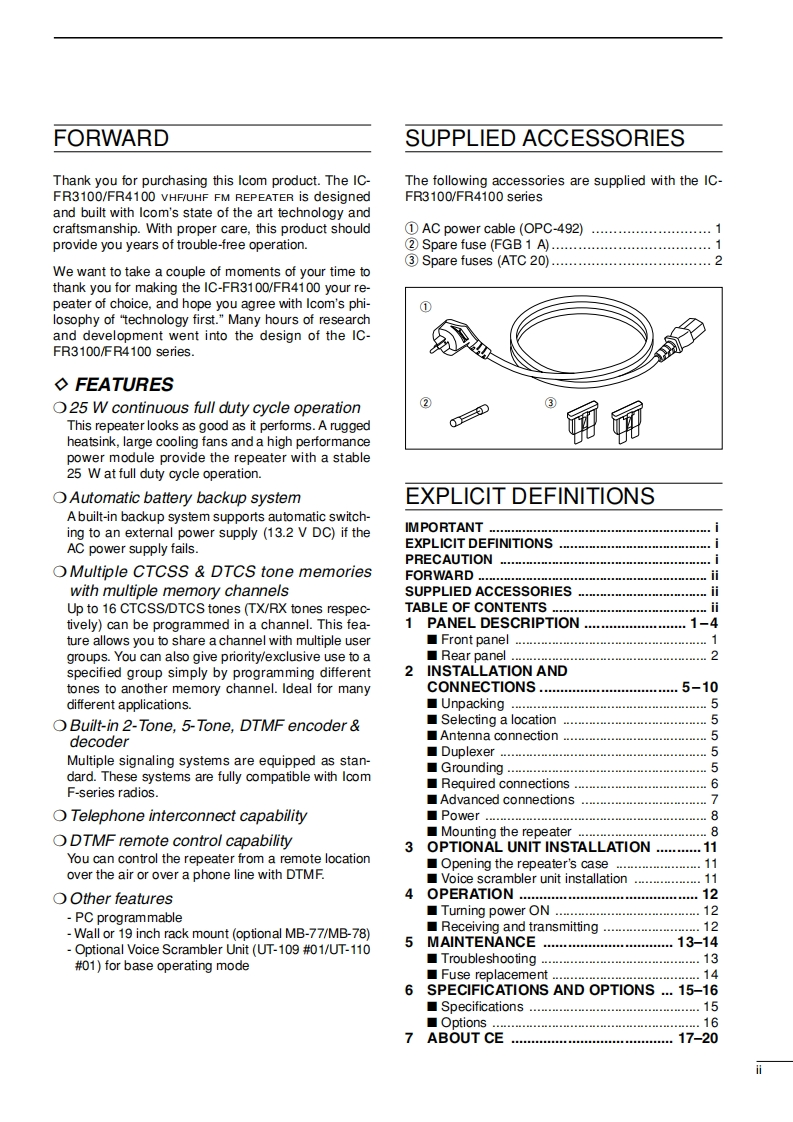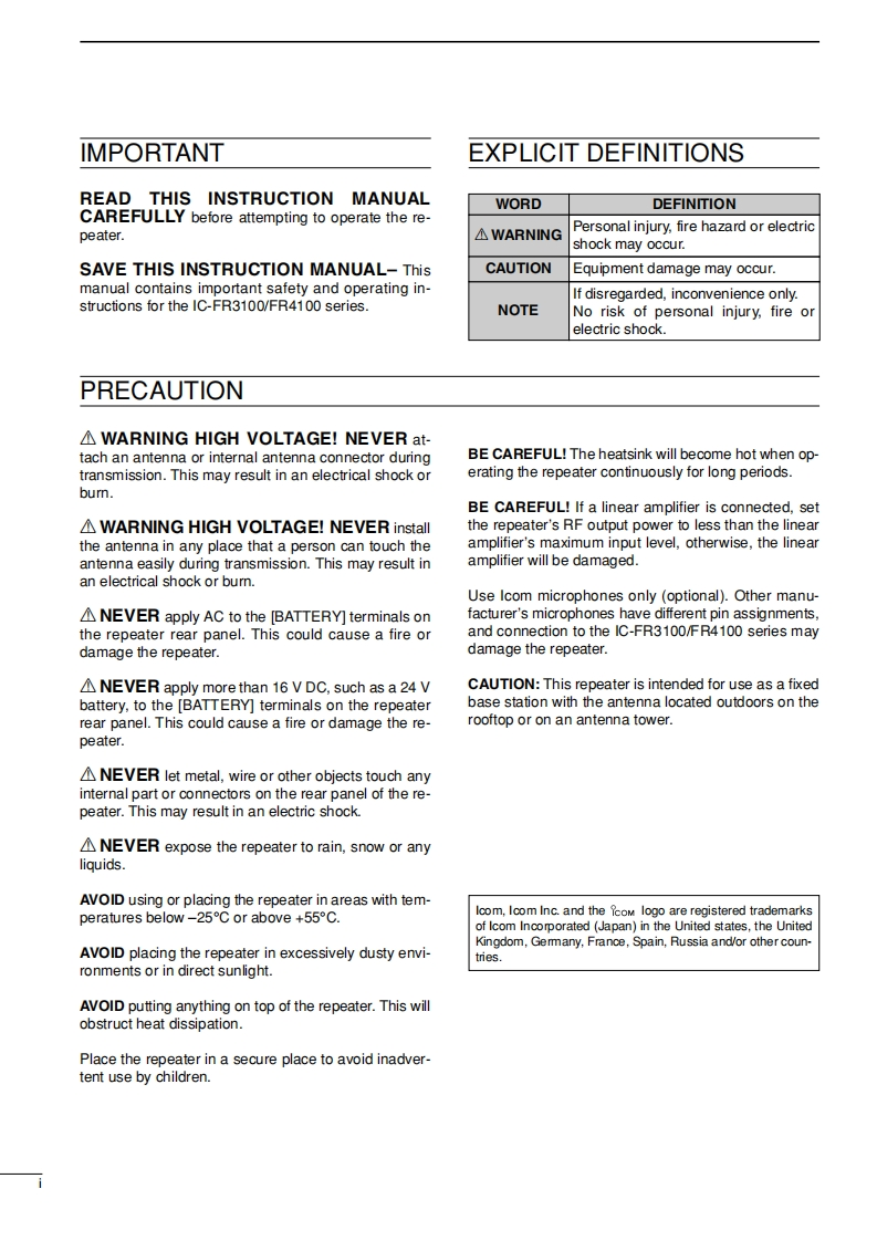 手册编号119:Icom_IC-FR3100_IC-FR4100_使用说明书手册找手册网33天前发布关注私信1.88MB25页029手册编号119:Icom_IC-FR3100_IC-FR4100_使用说明书手册此内容为付费资源,请付费后查看¥19¥23黄金会员免费钻石会员免费登录购买付费资源 第1页 / 共25页 第2页 / 共25页 第3页 / 共25页 第4页 / 共25页 第5页 / 共25页 试读已结束,还剩20页,您可下载完整版后进行离线阅读 THE END艾可慕 文本预览 TCOMINSTRUCTION MANUALVHF FM REPEATERIC-FR3100S2 H Icom Inc.可δ8UHF FM REPEATERIC-FR4100Icom Inc. 查看更多 收起部分 喜欢就支持一下吧收藏