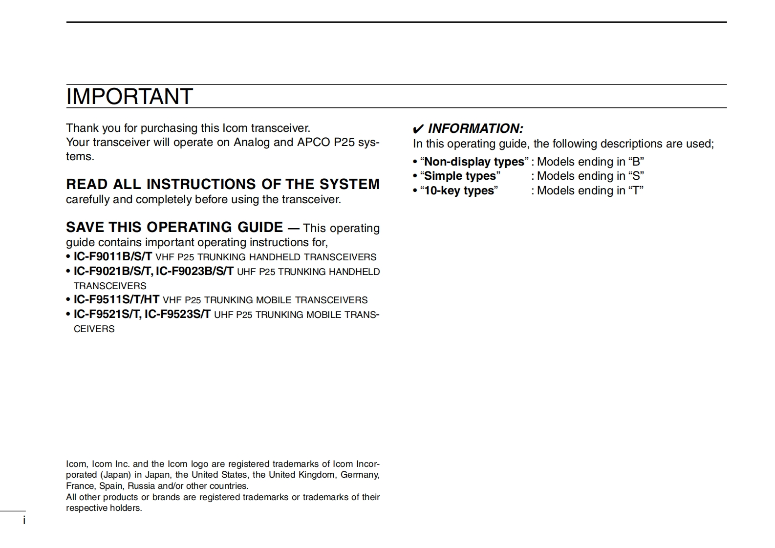 手册编号132:Icom_IC-F9010_IC-F9020_IC-F9510_IC-F9520_series_使用说明书手册_2009找手册网33天前发布关注私信1.60MB52页043手册编号132:Icom_IC-F9010_IC-F9020_IC-F9510_IC-F9520_series_使用说明书手册_2009此内容为付费资源,请付费后查看¥19¥23黄金会员免费钻石会员免费登录购买付费资源 第1页 / 共52页 第2页 / 共52页 第3页 / 共52页 第4页 / 共52页 第5页 / 共52页 试读已结束,还剩47页,您可下载完整版后进行离线阅读 THE END艾可慕 文本预览 COMQI G I T A L WI R E L E SSS A N25OPERATING GUIDEFOR IC-F9010/IC-F9020/IC-F9510/IC-F9520 SERIESANALOG/APCO P25 MODEOPERATIONSIcom Inc. 查看更多 收起部分 喜欢就支持一下吧收藏
