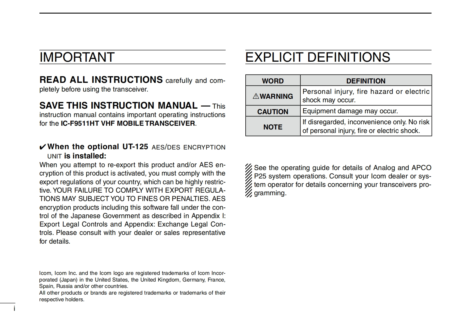 COMINSTRUCTION MANUALVHF P25 TRUNKINGMOBILE TRANSCEIVER2ABCIC-F9511HT是-51HT4 GHPORS0This device complies with Part 15 of the FCC Rules.Op-eration is subject to the condition that this device doesnot cause harmful interference.Icom Inc.