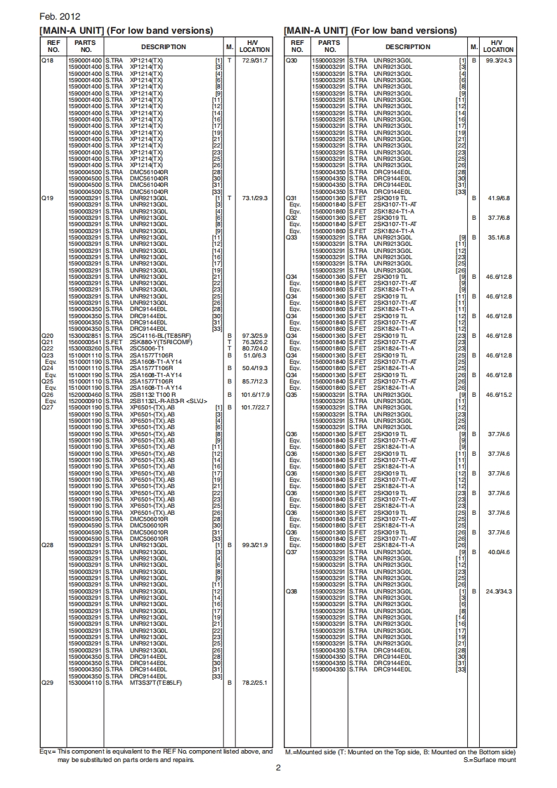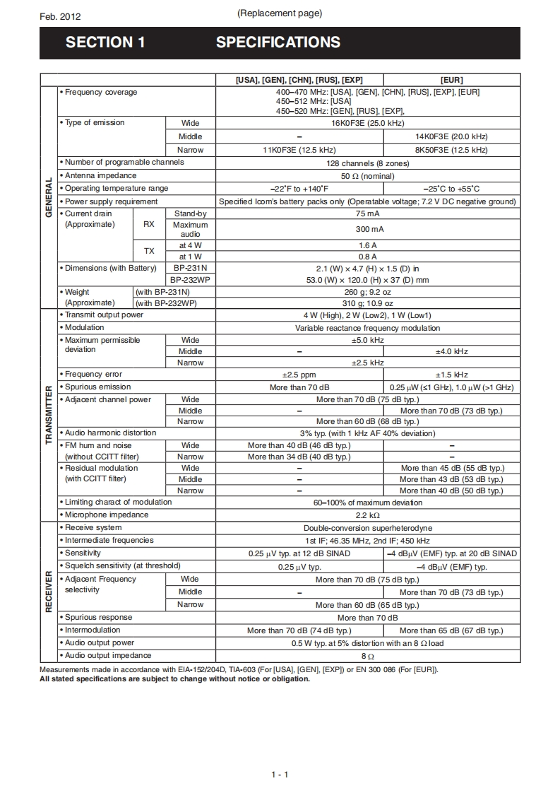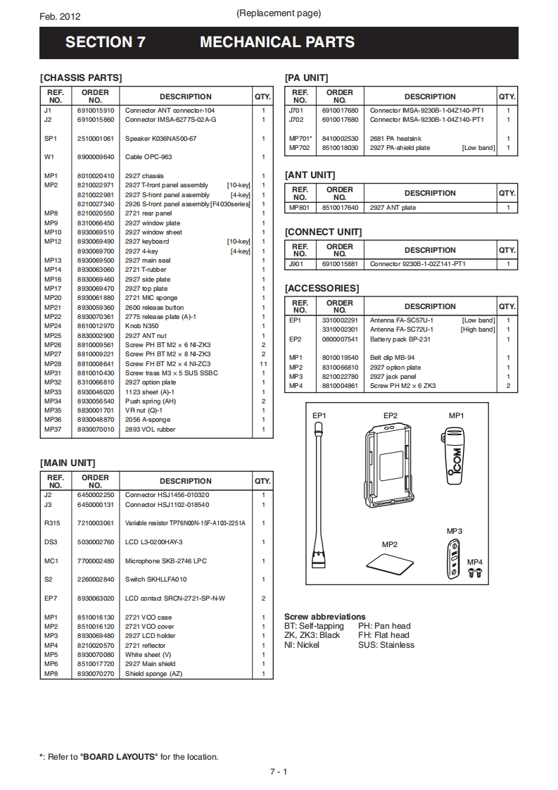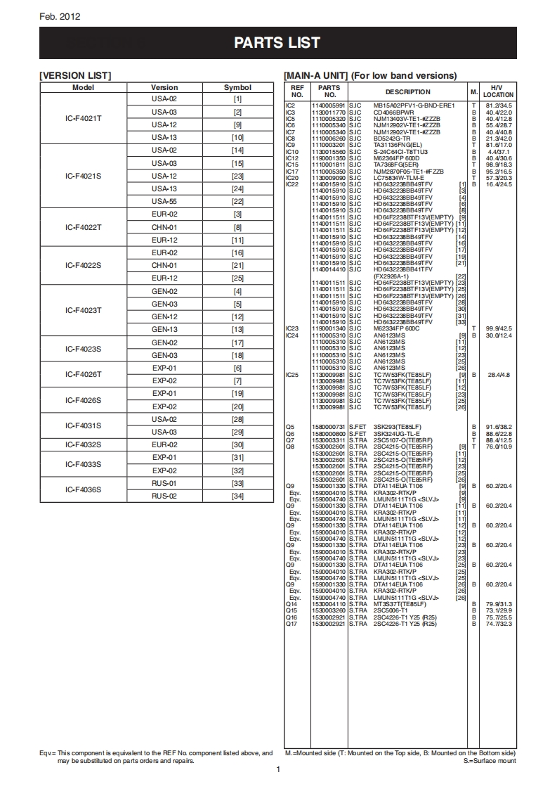 Feb.2012iCOMSERVICE MANUALADDENDUM1C-F4021F4022/F4023/F4026/S/T1C-F4031S/F4032S/F4033S/F4036SCONTENTSREPLACEMENT PAGES..·1-1and7-1PARTS LIST..............1BOARD LAYOUTS.23VOLTAGE DIAGRAM.........................25[VERSION LIST]ModelVersionFrequency(MHz)Channel spacing(kHz)KeypadUSA-02400-470 (Low band)12.5/30.0USA-03450-520(High band)1C-F4021TUSA-12400-470 (Low band)10-keyUSA-13450-520 (High band)12.5/25.0USA-02400-470 (Low band)USA-03450-520 (High band)1C-F4021SUSA-12400-470 (Low band)4-keyUSA-136.25/12.5/25.0450-520 (High band)USA-5512.5/25.0EUR-026.2512.5/20.0/25.01C-F4022TCHN-0112.5/25.010-keyEUR-12400-470 (Low band)6.25/12.5/20.0/25.0EUR-0212.5/25.01C-F4022SCHN-014-keyEUR-126.25/12.5/20.0/25.0GEN-02GEN-031C-F4023T450-520 (High band)GEN-12400-470 (Low band)10-keyGEN-13450-520 (High band)1C-F4023SGEN-02400-470 (Low band)GEN-03450-520 (High band)4-key12.5/25.0EXP-01400-470 (Low band)1C-F4026T10-keyEXP-02450-520 (High band)EXP-011C-F4026S400-470 (Low band)EXP-02450-520 (High band)1C-F4031SUSA-02400-470 (Low band)USA-03450-520(High band)1C-F4032SEUR-0212.5/20.0/25.0400-470 (Low band)4-key1C-F4033SEXP-01EXP-02450-520 (High band)12.5/25.0RUS-011C-F4036400-470 (Low band)RUS-02450-520 (High band)