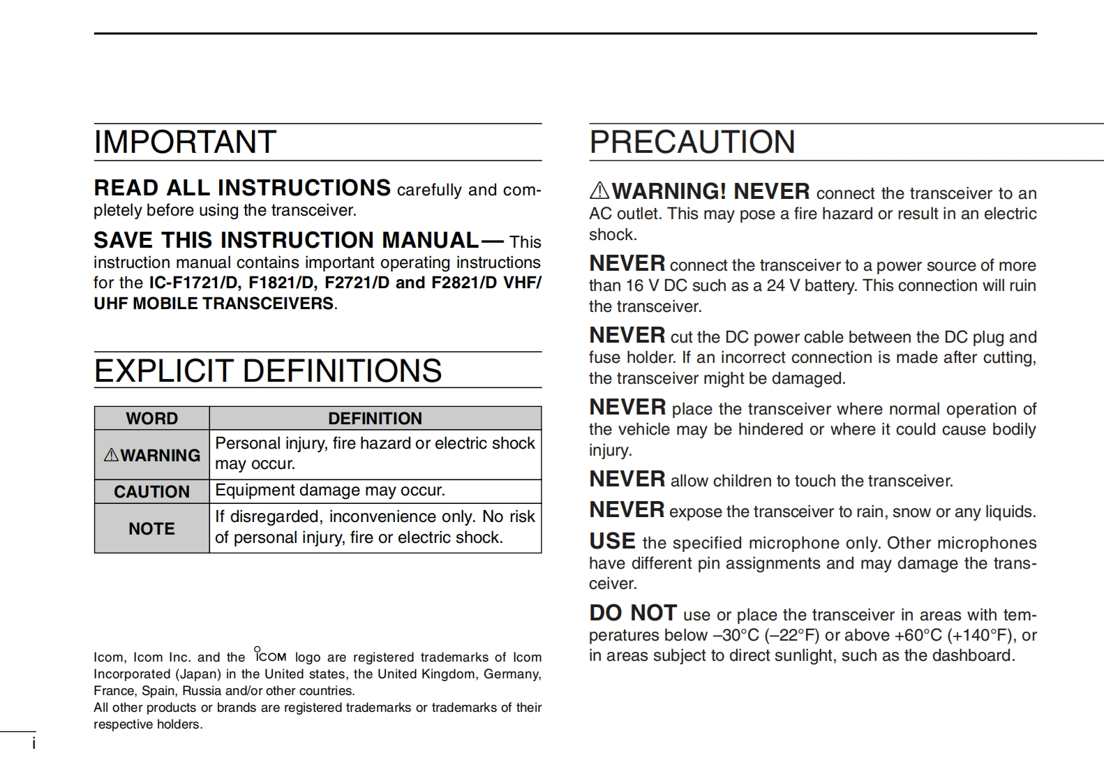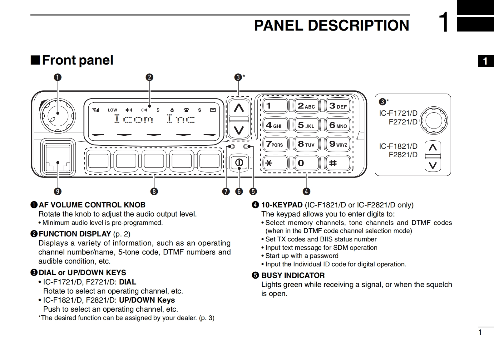 COMBIIS 1200CompatibleINSTRUCTION MANUALVHF MOBILE TRANSCEIVER1-F838UHF MOBILE TRANSCEIVER-3B2ABC 3 DEFIcom Inc5 JKL7PORSOThis model is IC-F1821/DThis device complies with Part 15 of the FCC Rules.or IC-F2821/DOperation is subject to the condition that this devicedoes not cause harmful interference.Icom Inc.