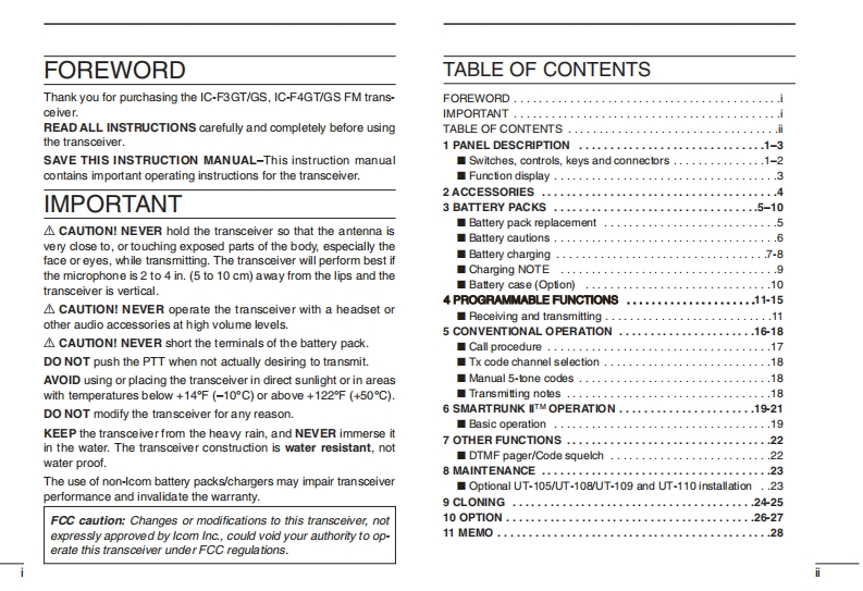 Count on us!COMSmarTrunk IINSTRUCTION MANUALCompatibleVHF TRANSCEIVERIC-F3GT/GSUHF TRANSCEIVERIC-F4GT/GS01This device comples with Part 15 of the FCC mles Oper.atfion is subject to the following two condifons:(1)This de.vice may not cause harmful interference,and (2)thisdevice must acoept any interference seoeived,including in.地e ence that may cause und地ired operation⊙⊙@⊙2D3DC-P34GS地ies8D9A-5621D-1EX-④Printed in JapanIcom Inc.©1999lcom1nc.1-1-32 Kamiminami Hirano-ku,Osaka 547-0003 JapanIcom Inc.