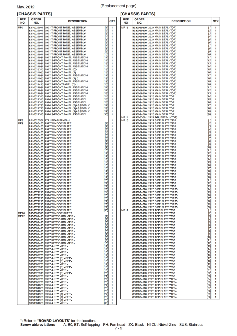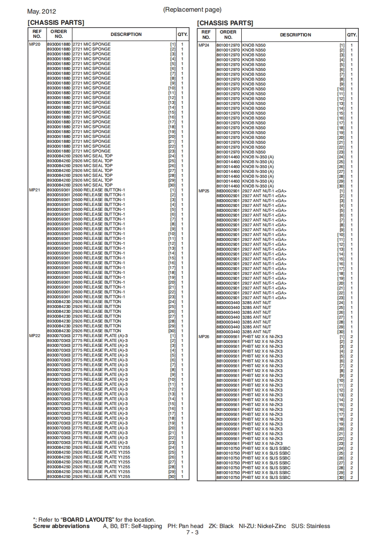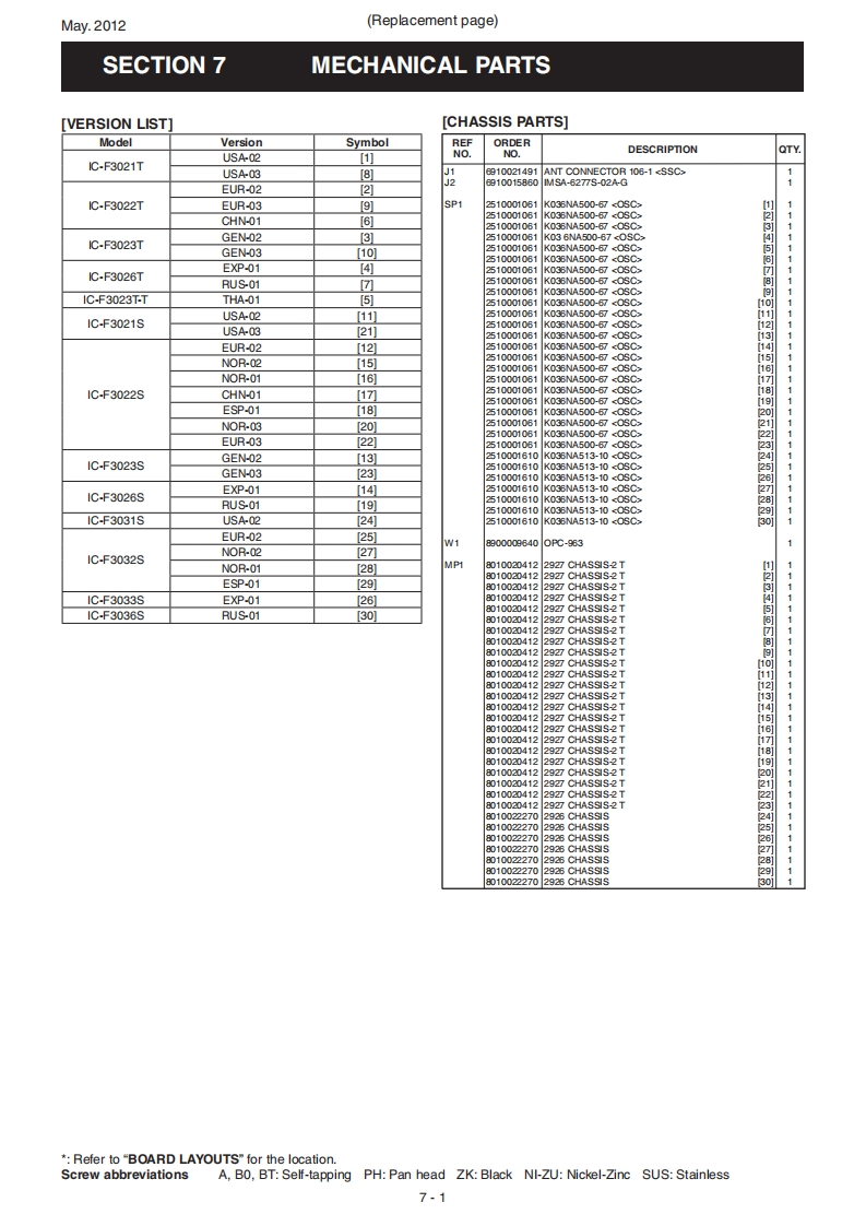 May.2012iCOMSERVICE MANUALADDENDUMC-F3020 seriesCONTENTSREPLACEMENT PAGES...................7-1to7-6PARTS LIST...........·BOARD LAYOUTS.....·13VOLTAGE DIAGRAM.....................15[VERSION LIST]FrequencyModelVersionrangeChannel spacing(kH也)Key(MH也)USA-0215.0/30.01C-F3021TUSA-036.25/15.0/30.0且UR-0212.5/20.025.0IC-F3022T且UR-036.25/12.5/20.0/25.0CHN-0112.5/25.01C-F3023TGEN-0210 keyGEN-036.25/12.5/25.01C-F3026TEXP-01RUS-0112.5/25.01C-F3023T-TTHA-01USA-0215.0/30.0IC-F3021SUSA-036.25/15.030.0且UR-0212.5/20.025.0NOR-02NOR-01136-174I1C-F3022SCHN-0112.5/25.0ESP-01NOR-03且UR-036.25/12.5/20.0/25.01C-F3023SGEN-0212.5/25.0GEN-036.25/12.5/25.04 keyEXP-011C-F3026S12.5/25.0RUS-011C-F3031SUSA-0215.0/30.0且UR-0212.5/20.025.0NOR-021C-F3032SNOR-01ESP-0112.5/25.0I1C-F3033SEXP-01I1C-F3036SRUS-01