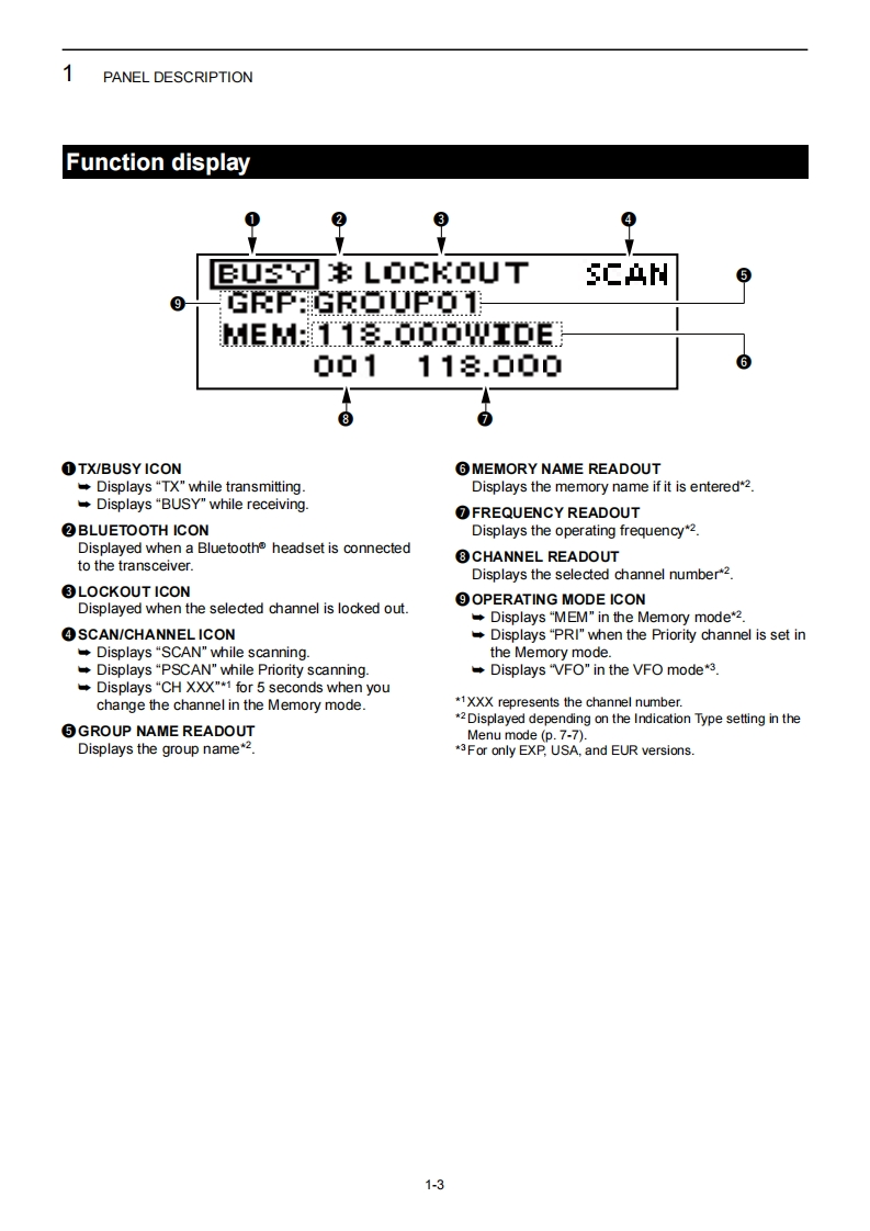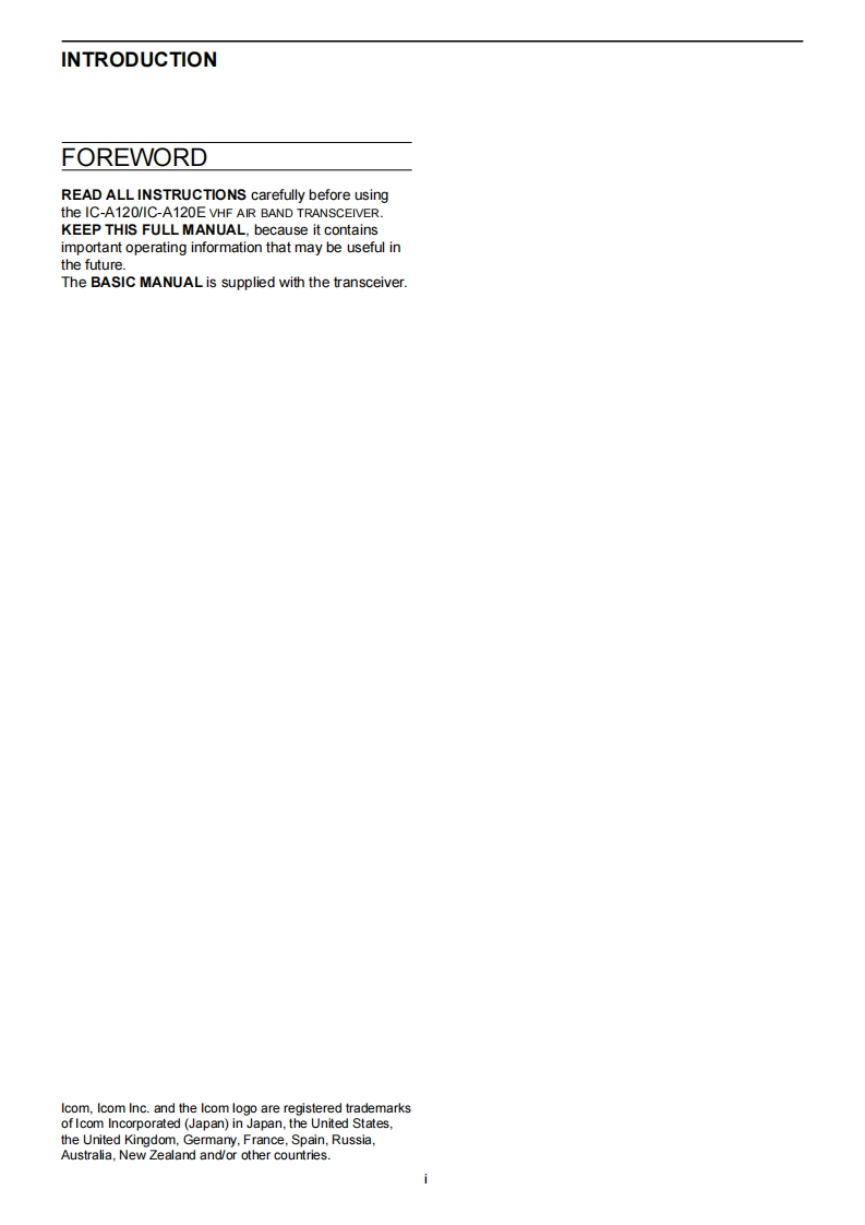 COMFULL MANUALINTRODUCTION1PANEL DESCRIPTION2 BASIC OPERATION3SCAN OPERATION4MEMORY OPERATIONVHF AIR BAND TRANSCEIVER5OTHER FUNCTIONSIEA1E6Bluetooth®OPERATION7MENU MODE8 CONNECTION AND INSTALLATION9SPECIFICATIONS AND OPTIONS10 CI-V INFORMATIONINDEXIcom Inc.