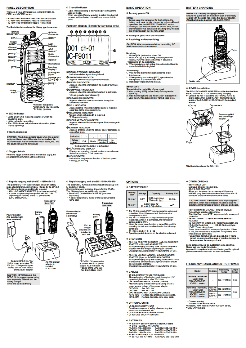 RECOMMENDATIONICOM兰”INSTRUCTIONSE WAT时的VHF P25 TRUNKING△NARNNGI NEVERHANDHELD TRANSCEIVERSIC-F9011 seriesNOTE:the tran。8E9e95ai829eawcmedgamery pack to.UHF P25 TRUNKINGanHANDHELD TRANSCEIVERSIC-F9021 seriesEXPLICIT DEFINITIONSIC-F9023 seriesBattery cautionateury anr色tin the ose the battery火uie beCAUON Eouicmentdamaoe maveeeurng alon me ome3F)NOTEThis instr88篇ELD TRPRECAUTIONS会2DANG ER!DO NOT hamme orthis pro△NARNNG!NEVER hold the radiomee coerone Sto 10 mCharging cautionADANGE NEVERe.ram he bIto the rad that theeqipment thatade water wille hewn中nging-arnpkco ine and the lcom logo aa tradeark and property of Digtal VeiceIcom Inc.Count on us!E2D-1U3-04L20920a202SAFETY TRAINING INFORMATIONSUPPLIED ACCESSORIES◇Flexible antennaWARNINGthedois NOT iFCC INFORMATION-1c0gneFe3thot an antema may由nage the◇Battery pack(C953-19021Beltclipmowundl theCAUTON Changes ar med to this trakes a dikNEVER rekase or athe bamery pack when theABOUTIPRCAUTION77229DO NOTand mtheVOICE CODING TECHNOLOGYThe AMBE+2M vdoe codinged by in702