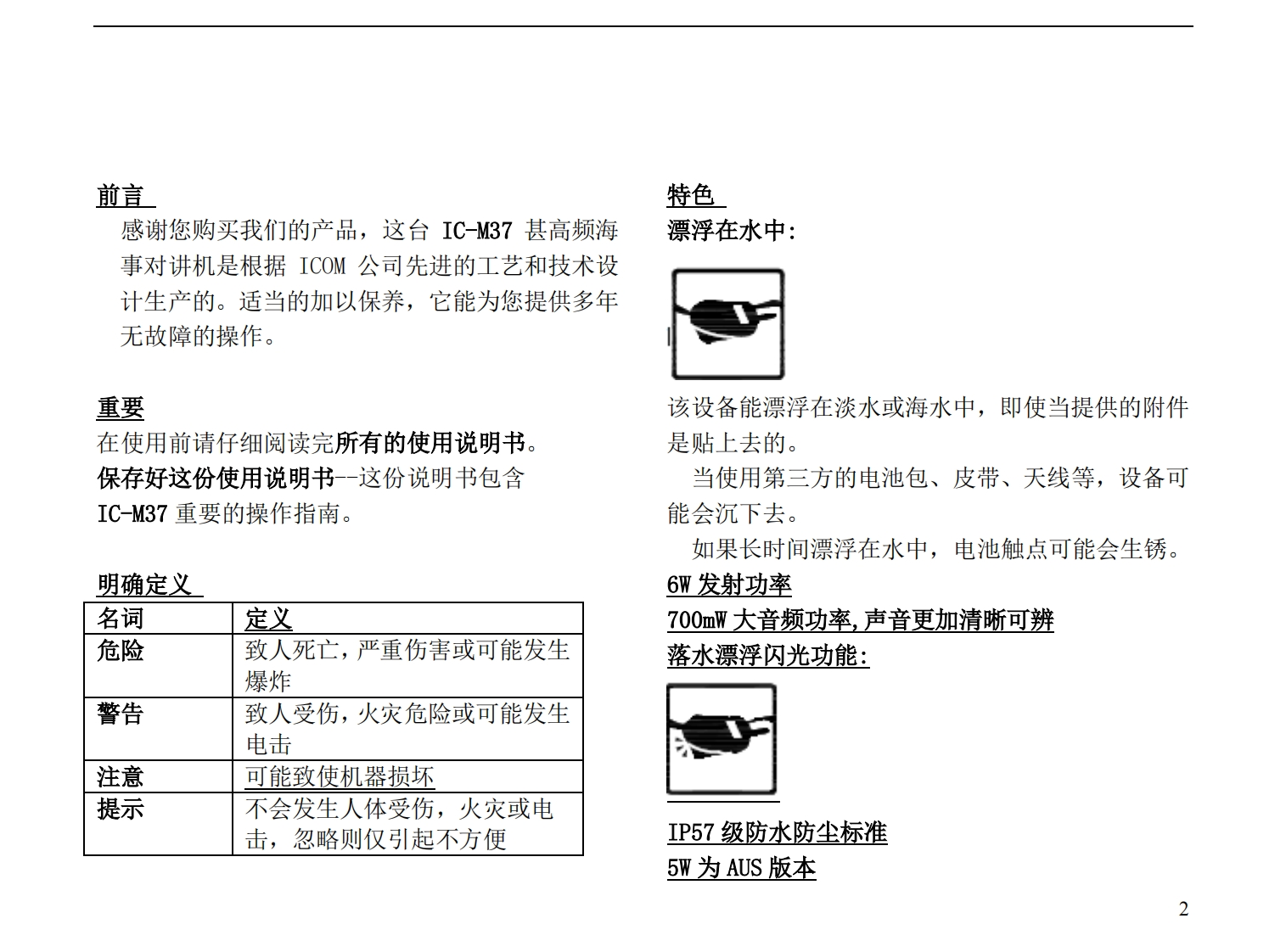 手册编号19:艾克幕ICOM-IC-M37中文简易使用说明书手册找手册网33天前发布关注私信1.22MB27页041手册编号19:艾克幕ICOM-IC-M37中文简易使用说明书手册此内容为付费资源,请付费后查看¥19¥23黄金会员免费钻石会员免费登录购买付费资源 第1页 / 共27页 第2页 / 共27页 第3页 / 共27页 第4页 / 共27页 第5页 / 共27页 试读已结束,还剩22页,您可下载完整版后进行离线阅读 THE END艾可慕 文本预览 COMINSTRUCTION MANUALVHF MARINE TRANSCEIVERIC MZECOM-MThis devioe comples with Part 15 ofthe FCC rules.Operation Is sublect tothe conditions that this device does notcause hamful Interference.Icom Inc. 查看更多 收起部分 喜欢就支持一下吧收藏
