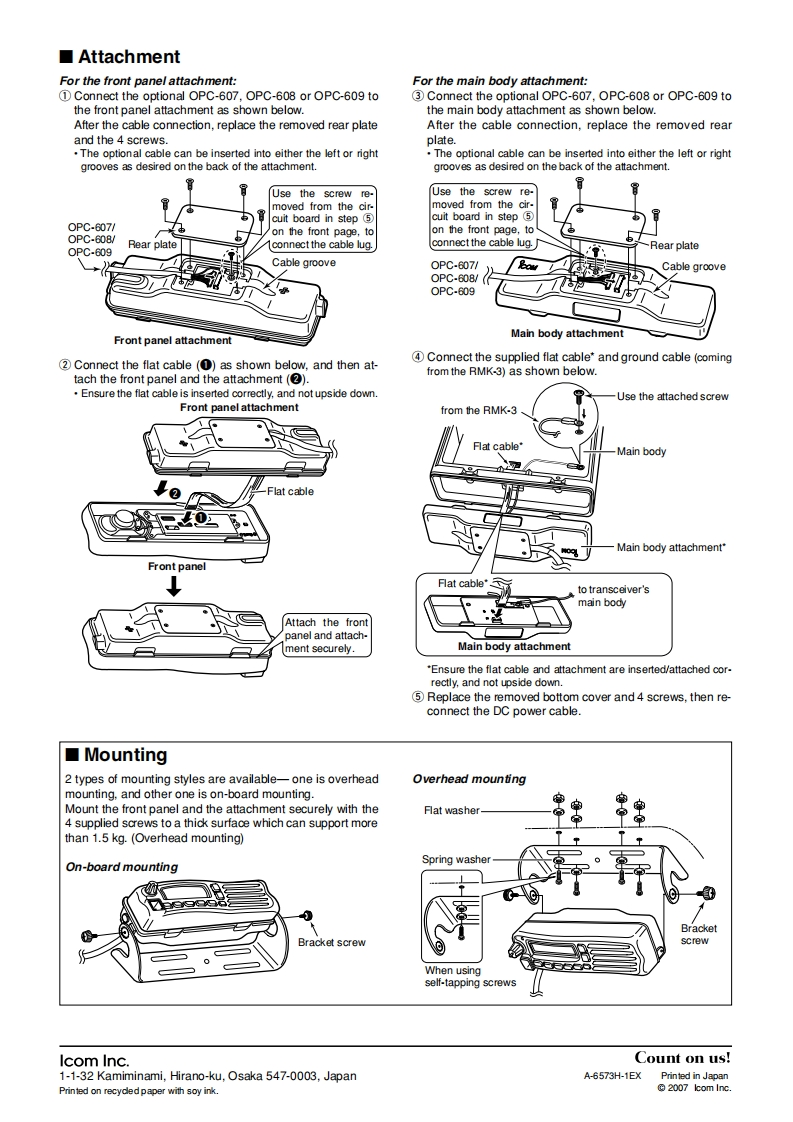 iCOMThank you for purchasing the RMK-3 sEPARATION KIT.The RMK-3 allows you to install the mobile trans-INSTRUCTIONSceiver front panel separately from the main body foradded installation convenience and operation.UseSEPARATION KITeither the optional OPC-607,OPC-608 or OPC-609RMK-3SEPARATION CABLE with the RMK-3.In this instruction,the illustration is described using the IC-F5060 series transceiver.Supplied accessoriesMain body attachmentMounting bracket月at washersMounting screws(M5)M5x12)香香香香T1610Spring washersSelf-tapping screws(M5)M5x16)垂电形形o008Front panel attachmentFlat cableNuts (M5)Bracket screws西西香卷甲甲■SeparationCAUTION!To avoid damage to the transceiver,turn theDisconnect the flat cable OPC-1297A from the front panel.power OFF before separating the front panel from themain body.Flat cableMain bodyThe optional OPC-607 (3 m:9.84 ft),OPC-608(8 m;26.3 ft)orOPC-609*(1.9 m;6.3 ft)SEPARATION CABLE is required for in-stalling the transceiver front panel and main body separately."For Europe version,only the OPC-609 is available.DTurn the transceiver's power OFF,then disconnect the DCFront panelpower cable.2Unscrew the 4 bottom screws.then remove the bottomcover from the transceiver in the direction of the arrow.Flat cable_Front panel5 Unscrew the 4 rear plate screws.then remove the rearplates from both the front panel and main body attach-ments.Bottom cover'This illustrationshows the descrip-3 Remove the front panel from the main body using a stan-tion for the frontdard screw driver as shown below.panel attachment.StandardRear plateUnscrew the cir-screw drivercuit board screw.Main bodyContinue to the back page.Front panellcom,lcom Inc.and the Ycom logo are registered trademarks of Icom Incor-tes,the United Kingdom Germany,France