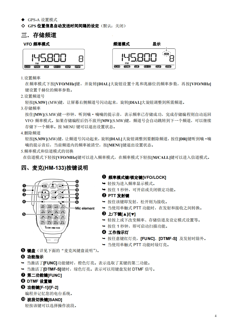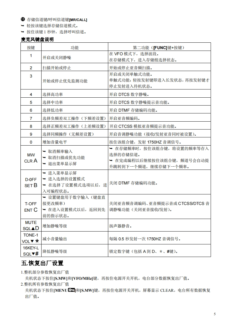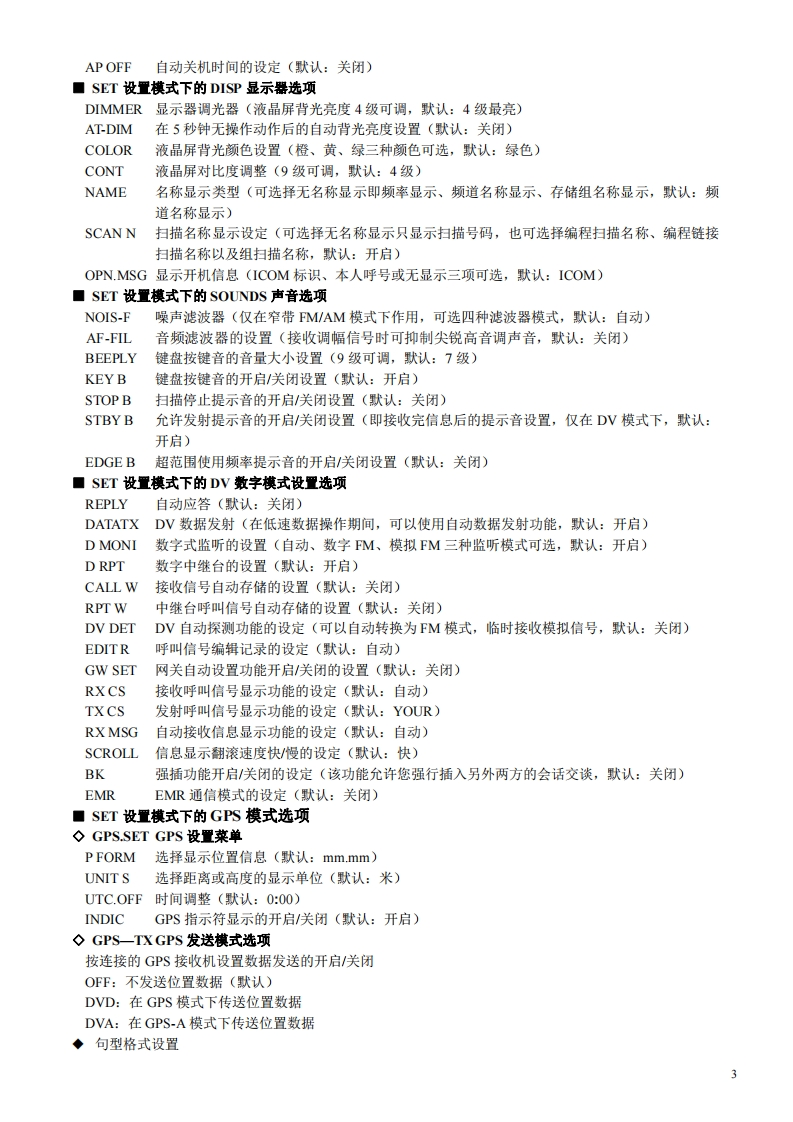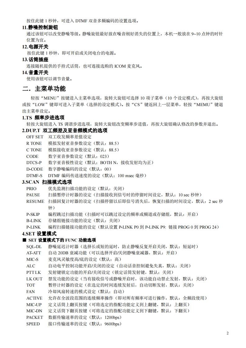 D-E880简易中文说明书面板按键介绍功能显示(液晶显示)OIG/TRL■x■On DUP-0DTC5QL-RPRIO GP5回站0☑☑☑☑☑R可LOWMID FMNAMDVGA BUSY型ONE UR RX-3DUPC四FOMHMCALL346巾12131菜单键、键盘锁键轻按此键进入本机菜单,可设定电台具体参数:长按此键可锁住键盘,使面板按钮失效。2.选择存储写入键、频道存储键轻按此键进入存储写入模式,频道号开始闪动,可以选择未存储频率的隐藏频道(空频道):长按此键可将设置的频率和操作模式等信息编程存储到当前的频道里。3.调谐旋钮频率模式下旋转该钮可以调整频率,信道模式下可以选择存储频道。另外,还用于设置模式选项的设置以及扫描方向的设置。4频段键、模式键在频率模式下轻按该钮进入频段选择状态,再旋转该钮即可改变频段:按住该钮1秒钟进入操作模式选择状态,再旋转该钮即可改变当前频率的通讯模式,比如FM、AM、DV数字模式等。5.频率模式键、兆赫位键、扫描键信道模式下轻按此键可进入VFO频率模式:在VFO频率模式下,轻按此键可修改兆赫位的频率(1MHz或1OMHz):按住此键1秒钟,则进入扫描类型选择状态。扫描期间按此键则取消扫描。6.信道模式键、亚音设置键在VFO频率模式下,轻按此键进入信道模式:在信道模式下,轻按此键可进入呼叫频道:按住此键1秒钟,可进入音调(静噪)功能选择状态,再旋转大旋钮,即可选择设定当前显示频率的静噪(亚音频)功能。7.DR、UR键(D-STAR数字模式下)轻按此键可以选择D数字中继模式,再旋转旋钮即可选择要使用的数字中继台。在DV数字模式下,按住此键1秒钟,进入UR短信息选择状态,旋转旋钮选择UR短信总。8.短信息键、接收短信息键(D-STAR数字模式下)在DV模式下,轻按此键,显示当前短信总,再旋转大旋钮,选择UR、R1、R2和MY的短信息。在DV模式下,按住此键1秒钟,将接收到的短信息(呼叫者的和接收数字中继1/2的)调整设置到当前短信息。9.高低功率键、双工频差键轻按此键可以设定电台发射高中低三档功率:按住此键1秒钟,进入双工操作选择状态,再旋转大旋钮即可选择双工方向(频差的正负)。10.监听键、DTMF键轻按此键可以打开电台静噪开关:
