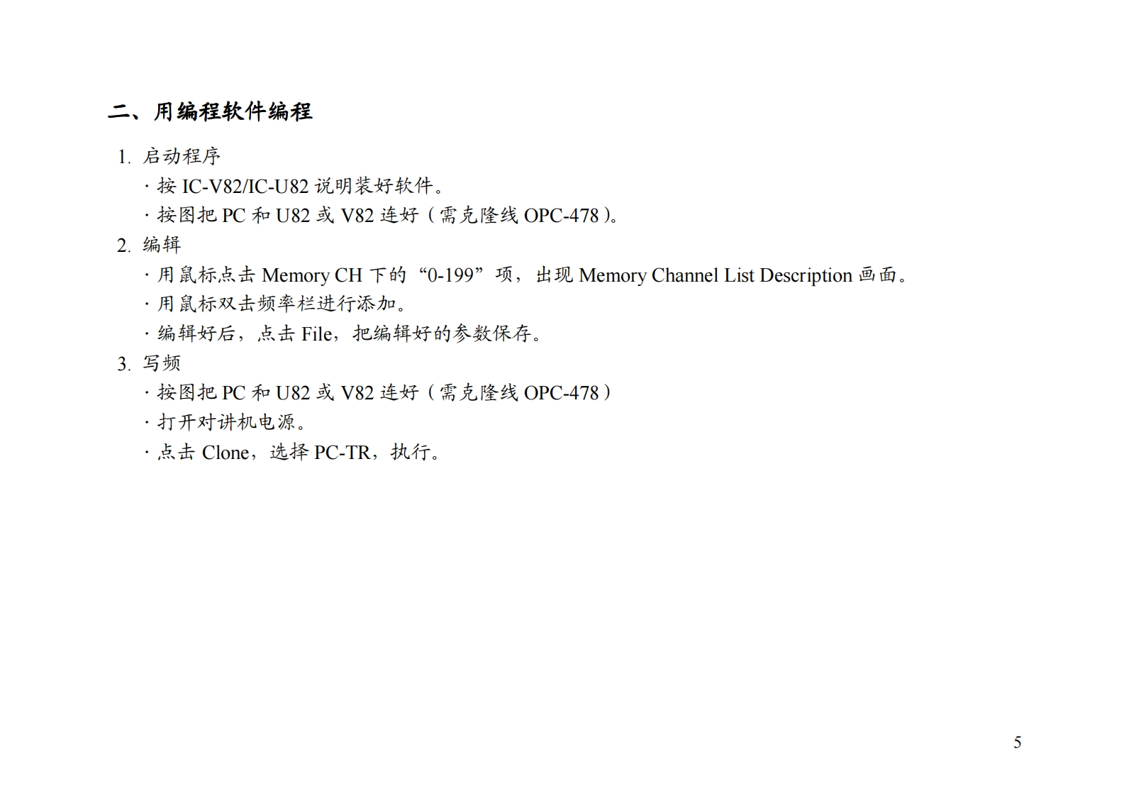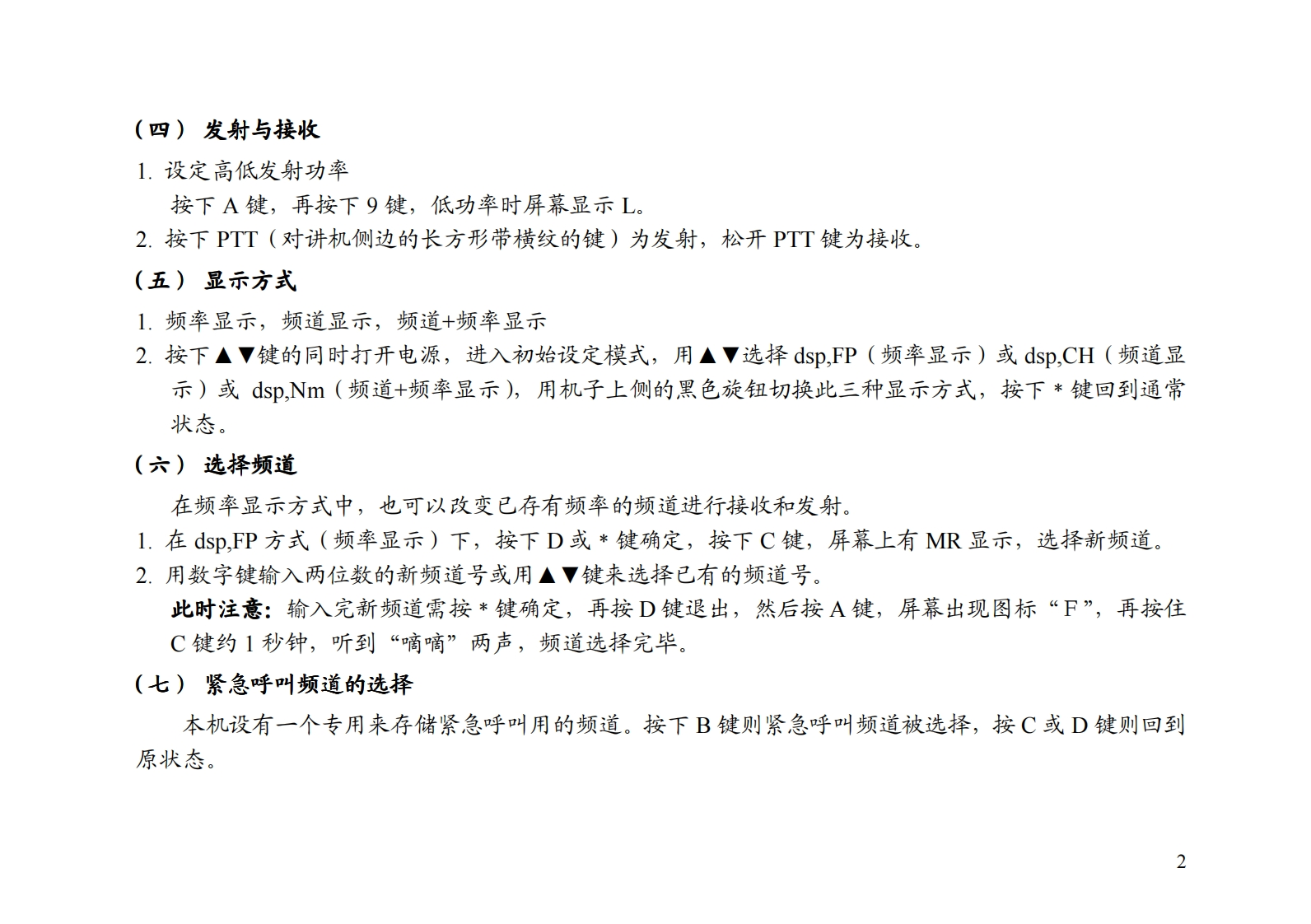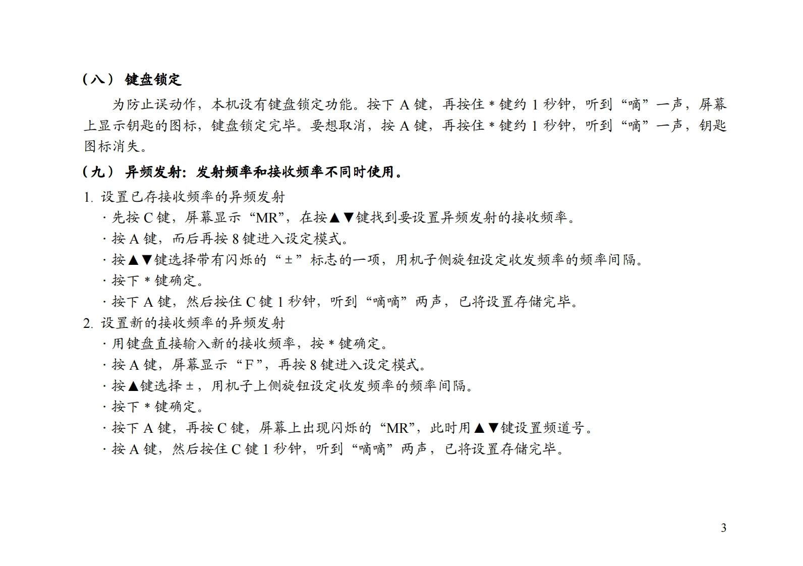 IC-V82/IC-U82的基本操作一、基本操作(一)打开电源:按下一排第四个橙色按键1秒钟,即可打开电源。(二)设定频率:1.通过键盘置频·直接用键盘输入您想要设置的频率参数。·按#键确定。·按A键,出现“F”。·按C键,显示闪烁的“MP”。·按▲T上下键,选择信道,然后在按A键出现“F”后,按住C键,听到“嘀嘀”两声,存储完毕。·重复以上步骤,存储下一个频率。2.用▲7键按所定的步骤增加或减少频率。(三)设定声音大小和静噪深度1.设定声音大小旋转上面的旋钮,可调节声音的大小。2.设定静噪深度按住MONI键的同时,按▲T键可调节静噪深度。(1为最小,10为最大)1
