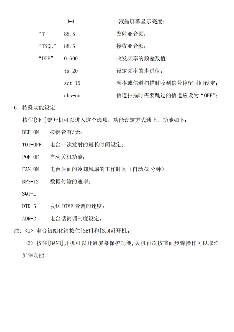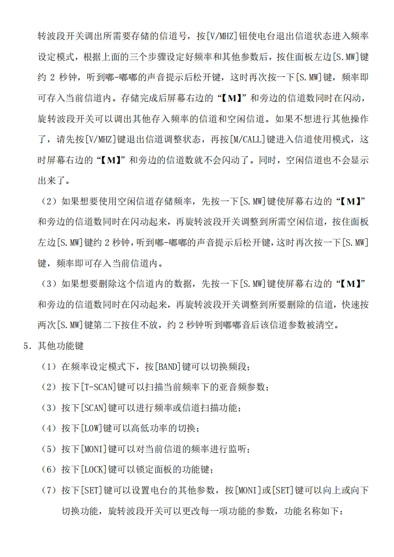 IC-207H简单使用说明按“PWR”按钮2秒钟打开电台,液晶屏幕显示当前频率,液晶下方显示的功能名称与屏幕下方的六个按钮一一对应。当按液晶屏幕下方的六个功能按钮时,无黑框的功能名称起作用;长时间(两秒左右)按功能按钮时,黑框功能名称起作用。1.设置频率在屏幕右侧出现“【M】”时,说明电台现在是信道状态,旋转面板左下角的旋钮(波段开关)可以更改信道号。如果屏幕右侧没有出现“【M】”,说明电台正处在频率设定状态,旋转“波段开关”可以更改频率。同时,按[VMZ]可以调整兆赫位或千赫位的频率。2.频差设定按一下[DUP]按钮,屏幕左上方出现“DUP-”,说明现在的频率是收高发低;再按一下[DUP]按钮,屏幕左上方变成“DUP”,说明现在的频率是发高收低。频差位数的设定,不停按[SET]键直到看见屏幕左上角出现闪动的“DUP”时,通过设置频率的方式设置出所需的频差参数,按任意键退出即可。3.亚音频设定按一下[TONE]按钮,屏幕左上方出现“T”,这说明发射频率的亚音频参数已经设定成功:再按一下[TONE]按钮,屏幕左上方出现“TSQL(《·>)”这是电台收到一个带相同亚音频的信号时,会发出一组震铃音;第三次按[TONE]按钮,屏幕上方只有“TSQL”,这表示电台收到相同亚音频的信号后可以直接发出话音。亚音参数设定方法是不停按[SET]键直到看见屏幕左上角出现闪动的“T”,旋转波段开关调整发射频率的亚音频参数;再按一下[SET]键,屏幕左上方出现闪动的“TSQL”,这个亚音频参数是接收频率的。参数设定完成后按任意键退出。4.频率存储(1)按[M/CALL]键电台进入信道状态,这时屏幕右边显示“【M】”和信道数,旋