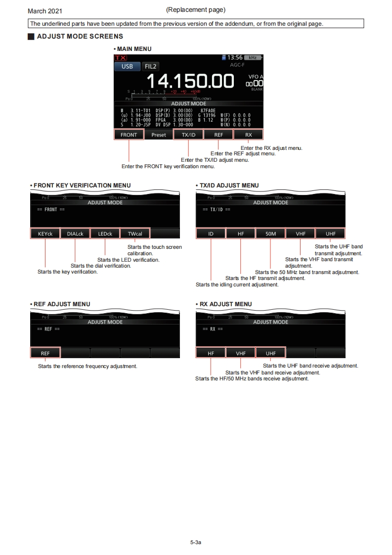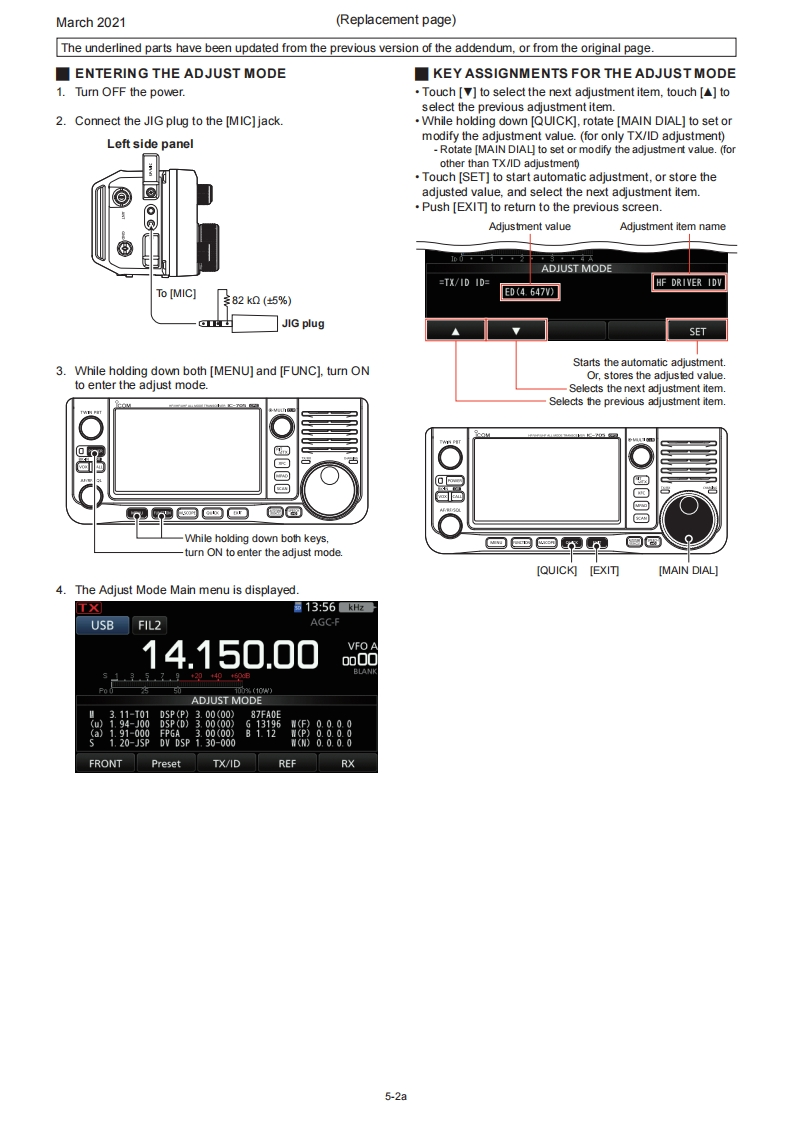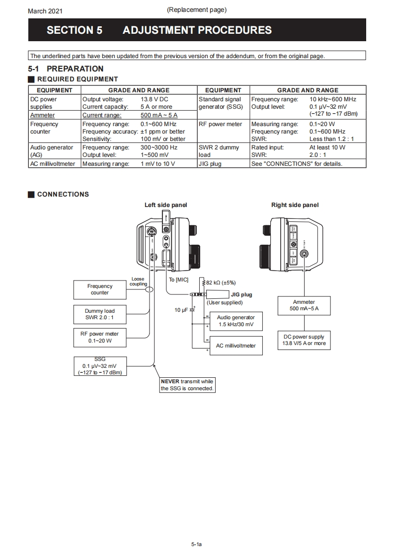 March 2021SERVICE MANUALERRATA1C-705Please note the following corrections and refer to the replaced pagesERRATASECTION 5 ADJUSTMENT PROCEDURESHEADINGDESCRIPTIONMISTAKE CORRECTION Page5-1 PREPARATIONIn the "REQUIRED EQUIPMENT"tableAmmeter wasAmmeter isnot in the tableadded.5-15-4 HF TRANSMITAdjustment value for the [HF TX Total Gain)ADJUSTMENT0.5w5.0w5-6item5-10 VHF BAND RECEIVE SSG frequency for the [VHF Tuned-BPF 1]72.2015MHz75.2015MHz5-17ADJUSTMENTitem5-11 UHF BAND RECEIVE SSG frequency for the [UHF Tuned-BPF402.2015MHz400.2015MHz5-19ADJUSTMENTitemNOTE:Corrected parts on each replaced page are underlined.REPLACED CONTENTSSECTION 5ADJUSTMENT PROCEDURES5-1a~5-19a