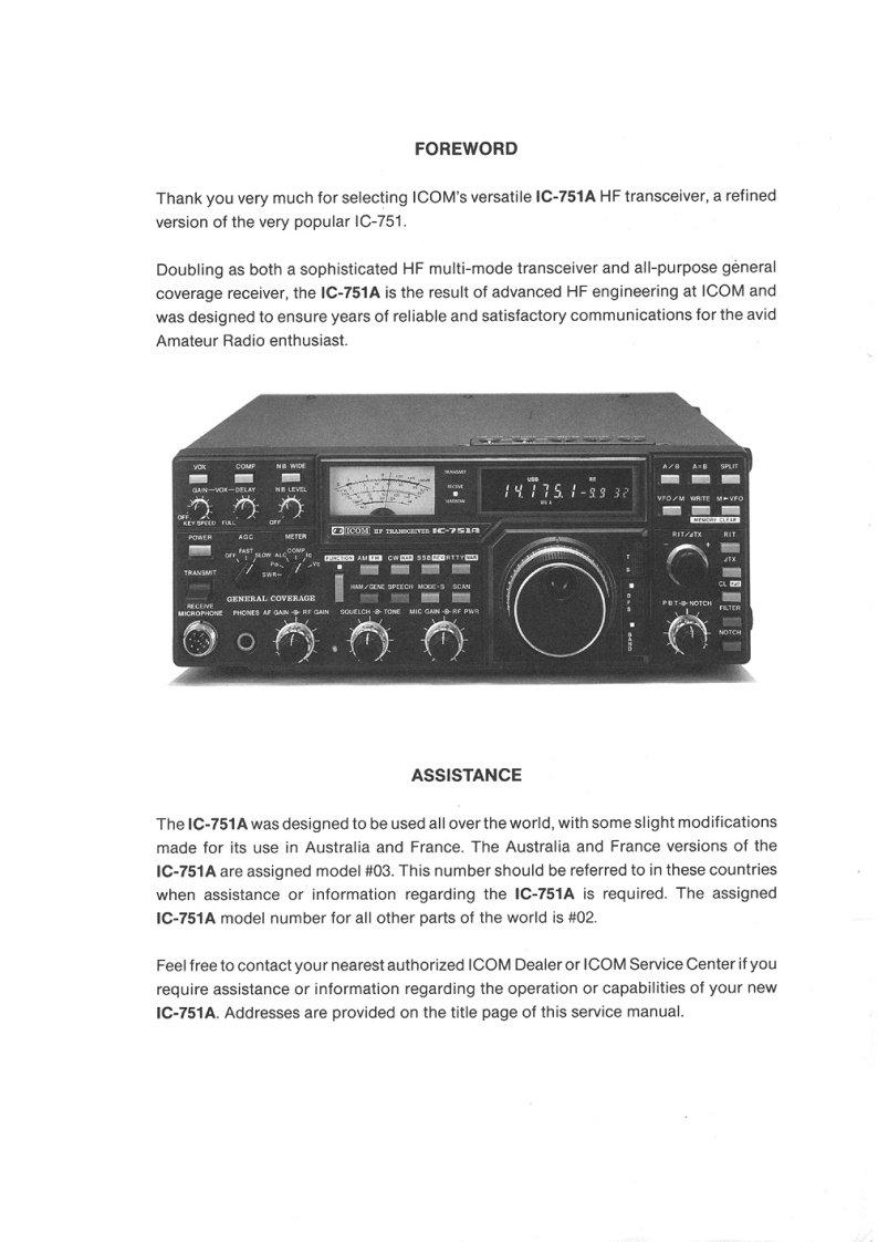 HF ALL BAND TRANSCEIVERGENERAL COVERAGE RECEIVERC-751ASERVICE MANUALICOMICOMINCORPORATED1-6-19.Kamikuratsukuri,Hirano-ku,Osaka 547.JapanPhone:(06)793-5301Telex:ICOM TR J63649ICOM AMERICA,INC.ICOM (EUROPE)GmbH,2380 116th Avenue N.EHimmelgeister Strasse 100Bellevue,WA 980044000 DOsseldort 1.Ph0ne:(206454-8156West GermanyTelex:230-152210 ICOM AMER BVUEPhone0211-346047Fax:(206)454-1509Telex:41-8588082 ICOM DFax0211-3336393150 Premier Dr.,Suite 126.Irving TX 75063ICOM AUSTRALIA,PTY..LTD.Ptho0e:214)550-75257 Duke Street,Windsor 3181.Fax214角550-7423Victoria,AustraliaPhone:t03)529-75821777 Phoenix Parkway,Suite 201.Telex:71-35521 ICOMASAtlanta.GA 30349Fax:03)529-8485Phone:(404)991-6166ICOM CANADA.LTD.3071-#5 Road,Unit 9.Richmond.B.C..Downloaded by▣V6X 2T4 CanadaPhone:(604273-7400Amateur Radio DirectoryLFax:G04273-1900▣www.hamdirectory.info