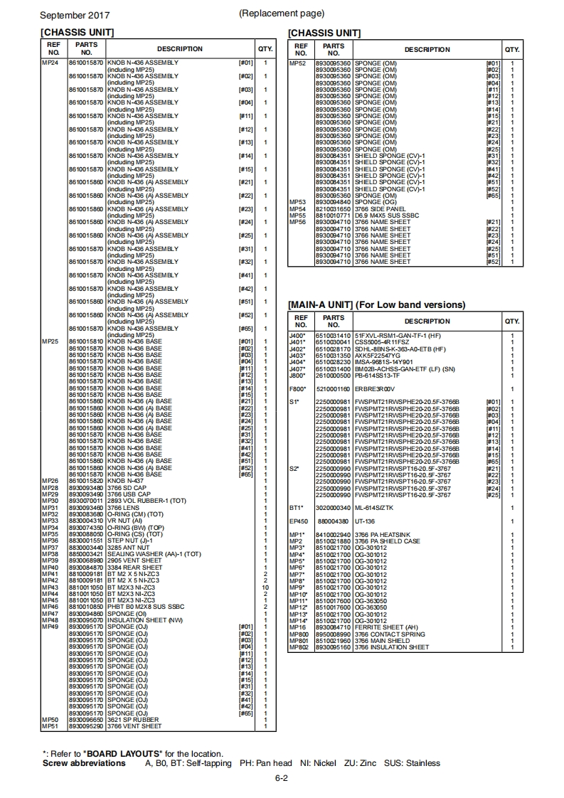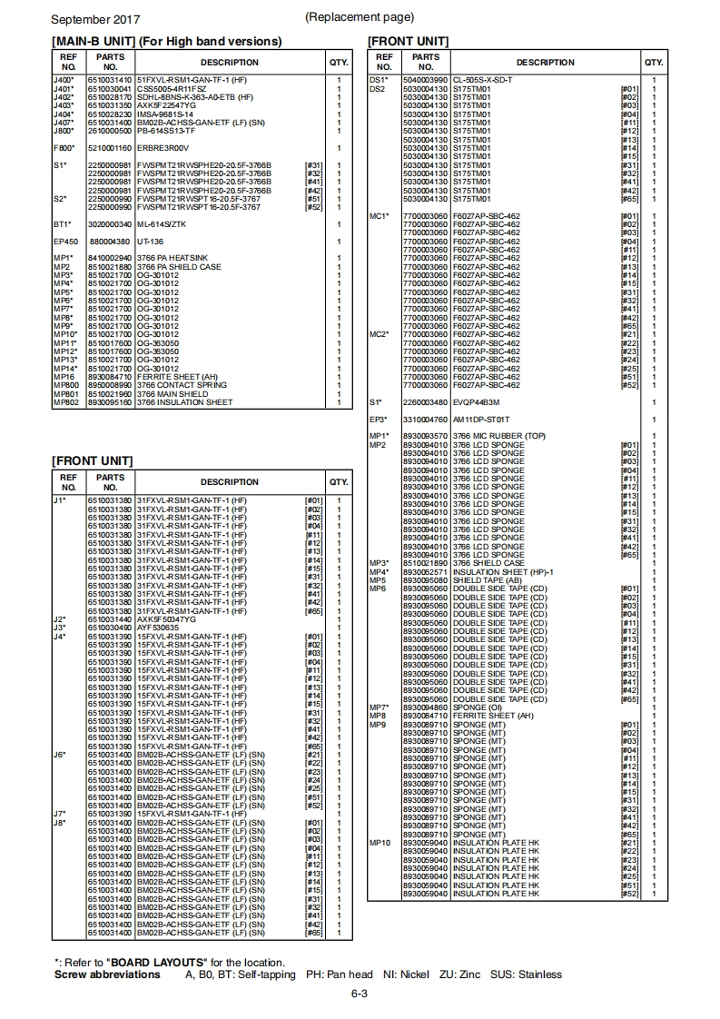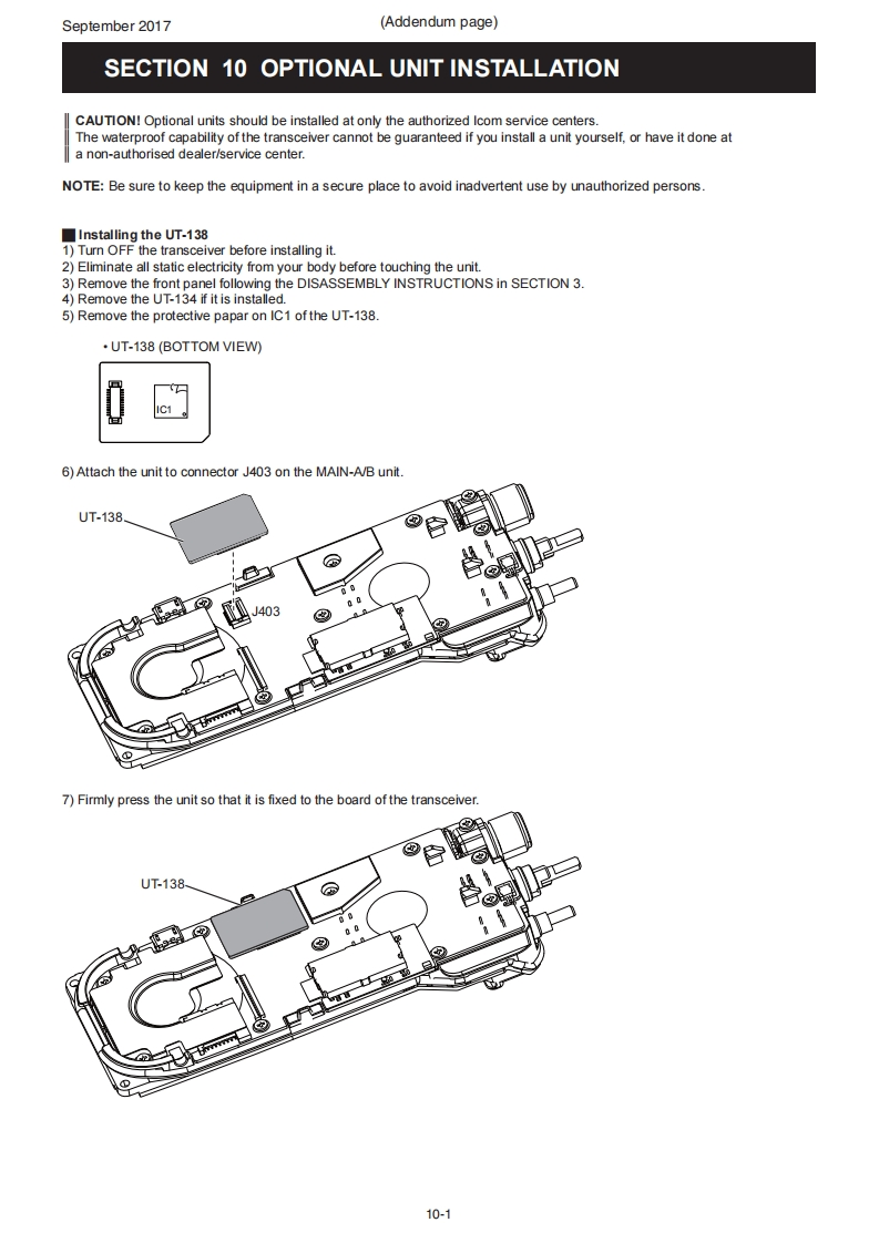 September 2017COMSERVICE MANUALADDENDUMIC-F4400D/IC-F4400DS/C-F4400DTNOTE:Use these amended pages as one addendum set.Do not mix them up with the previous master pages.CONTENTSNEWLY ADDED PAGE:OPTIONAL UNIT INSTALLATION..................................10-1REPLACEMENT PAGES:MECHANICAL PARTS6-16-5AMENDED PAGES:PARTS LIST .........1CIRCUIT DIAGRAM20[VERSION LIST刀VERSIONFREQUENCYMODELVERSIONKEY TYPEMAIN-AMAIN-BNUMBERRANGE(MHz)UnitUnitUSA-01#01]wEUR-01#02]1C-D4400DTCAN-01#03]Ten-key typeEXP-01#04]USA-11[#11EUR-11[#12IC-F4400DSCAN-11#13]Simple key type380-470EXP-11#14]VAUS-11[#15USA-21#21]WEUR-21#22]1C-F4400DCAN-21#23]Non-display typeWEXP-21#24]AUS-21[#25]USA-31IC-F4400DT#31]450-512AUS-31#32]450-520Ten-key typeUSA-411C-F4400DS#41]450-512AUS-41Simple key type#42]450-520IC-F4400DUSA-51#51]450-512Non-display typeAUS-51#52]450-520IC-F4400DTAUS-01[#65380-470Ten-key type*Newly added versions.Unit installed.