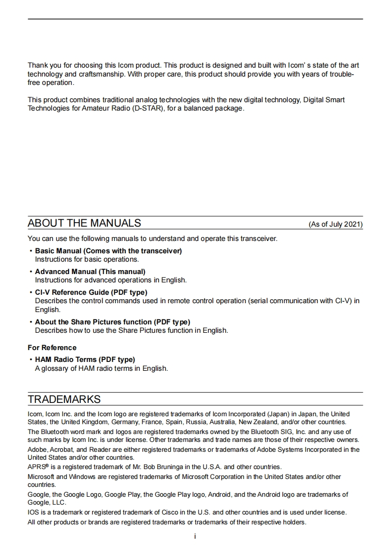@cOMADVANCED MANUALHFNHF/UHF ALL MODEINTRODUCTIONTRANSCEIVER1C-7051BATTERY CHARGING2ADVANCED OPERATIONS3SCOPE OPERATION (ADVANCED)4microSD CARD(ADVANCED)5 VOICE RECORDER FUNCTIONS6VOICE TX MEMORY FUNCTION7MEMORY OPERATION8 SCANS9 OTHER FUNCTIONS10 Bluetooth OPERATIONThis manual describes instructions for advanced features andinstructions.11 WIRELESS LAN OPERATIONSee the BASIC MANUAL that come with the transceiver forprecaufions and basic operations.12 GPS OPERATION(ADVANCED)13 D-STAR OPERATION (BASIC)14 D-STAR OPERATION (ADVANCED)15 ABOUT THE DV GATEWAY FUNCTION16 MAINTENANCE(ADVANCED)17 UPDATING THE FIRMWAREIcom Inc.18 ADVANCED CONNECTIONS