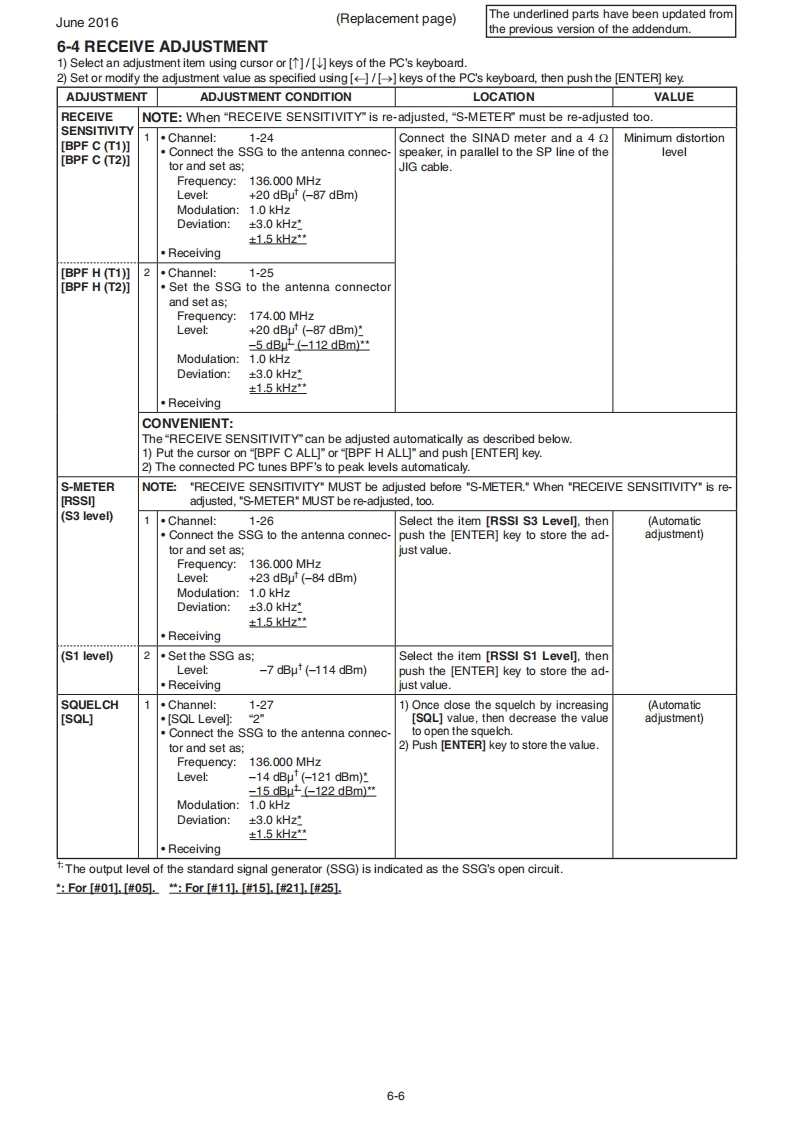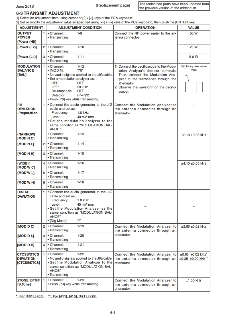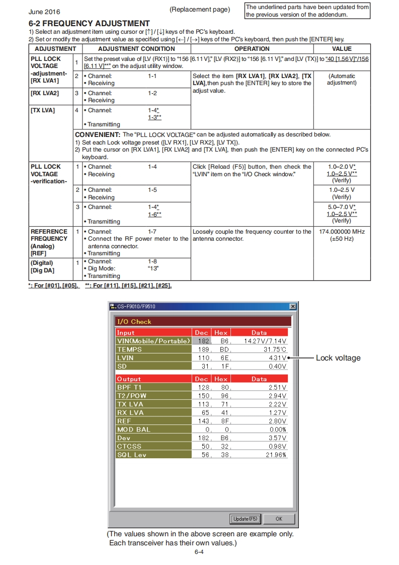 June 2016iCOMSERVICE MANUALADDENDUMIC-F9511S IC-F9511TNOTE:Use these amended pages as one addendum set.Do not mix them up with the previous master pages.CONTENTSREPLACEMENT PAGES:ADJUSTMENT PROCEDURE.....................6-4 to 6-6AMENDED PAGES:PARTS LIST..........BOARD LAYOUTS(MAIN-A/-B UNIT:B-8201A).......19VOLTAGE DIAGRAM......·........·..·21[VERSION LIST]VERSIONCHANNELMODELVERSIONFEATUREFRONTAFRONT-BMAINMAIN-ANUMBERSPACING(kHz)UNITUNITUNITUNIT1C-F9511SUSA-01#01]30.0/15.0/12.5Internal speakerIC-F9511TUSA-01[#05]30.0/15.0/12.510-keyIC-F9511SUSA-21[#11]12.5/25.0Internal speakerI1C-F9511TUSA-21[#15]12.5/25.010-keyIC-F9511SUSA-22[#21]12.5/25.0Internal speaker1C-F9511TUSA-22[#2512.5/25.010-key*Newly added versionsUNIT installed.
