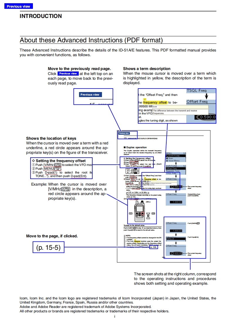 icOMTo update the repeater list,click here!ADVANCED INSTRUCTIONSINTRODUCTION1ACCESSORY ATTACHMENT2USING A MICROSD CARD3PANEL DESCRIPTION4BATTERY CHARGINGVHF/UHF TRANSCEIVER5BASIC OPERATIONID-51A6BC RADIO OPERATIONID-51E7 D-STAR INTRODUCTION8 D-STAR OPERATION