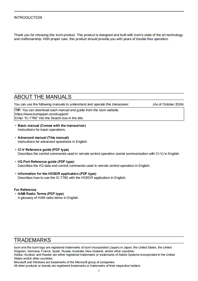 icomADVANCED MANUALHF/50 MHz TRANSCEIVER1 ADVANCED CONNECTIONSIC-77602ADVANCED OPERATIONS3 SCOPE OPERATION(ADVANCED)4SD CARD/USB FLASH DRIVE (ADVANCED)5 VOICE RECORDER FUNCTIONS6VOICE TX MEMORY FUNCTION7MEMORY OPERATION8 SCANS9 ANTENNA TUNER OPERATION(ADVANCED)10 CLOCK AND TIMERS(ADVANCED)11 OTHER FUNCTIONSThis manual describes instrucfions for advanced features and12 MAINTENANCE (ADVANCED)instrucfions.See the BASIC MANUAL that come with the transceiver forprecautions and basic operations.13 UPDATING THE FIRMWAREIcom Inc.