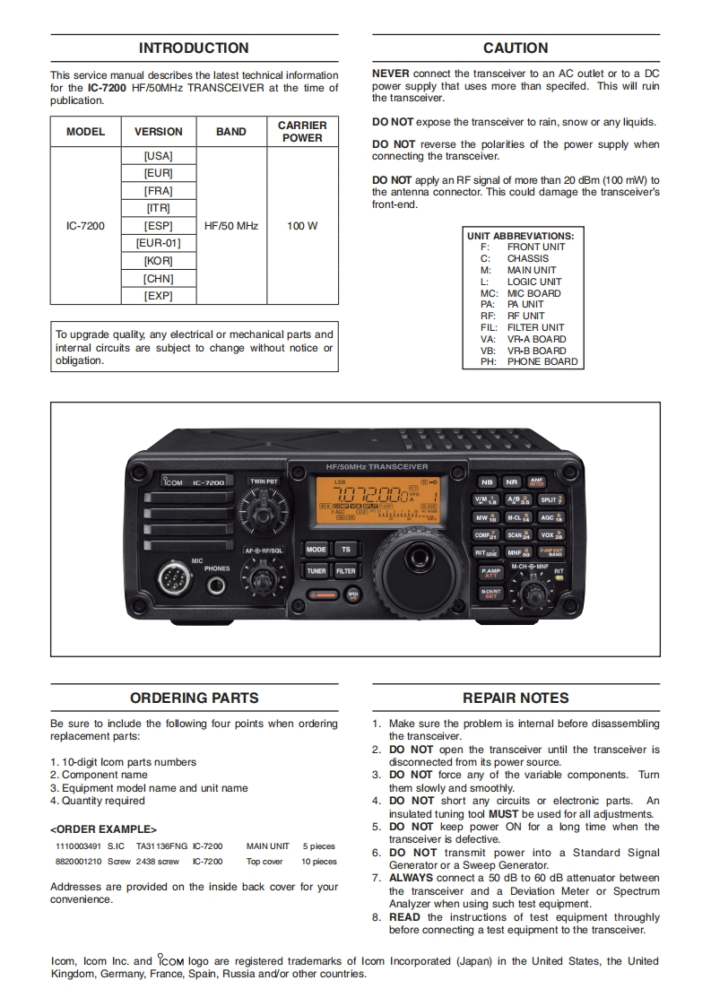手册编号316:ICOM-IC-7200_维修说明书手册_2008找手册网33天前发布关注私信9.22MB62页037手册编号316:ICOM-IC-7200_维修说明书手册_2008此内容为付费资源,请付费后查看¥19¥23黄金会员免费钻石会员免费登录购买付费资源 第1页 / 共62页 第2页 / 共62页 第3页 / 共62页 第4页 / 共62页 第5页 / 共62页 试读已结束,还剩57页,您可下载完整版后进行离线阅读 THE END艾可慕 文本预览 GcOMSERVICEMANUALHF/50MHz TRANSCEIVER1C-7200S-14513XZ-C1Oct.2008Icom Inc. 查看更多 收起部分 喜欢就支持一下吧收藏