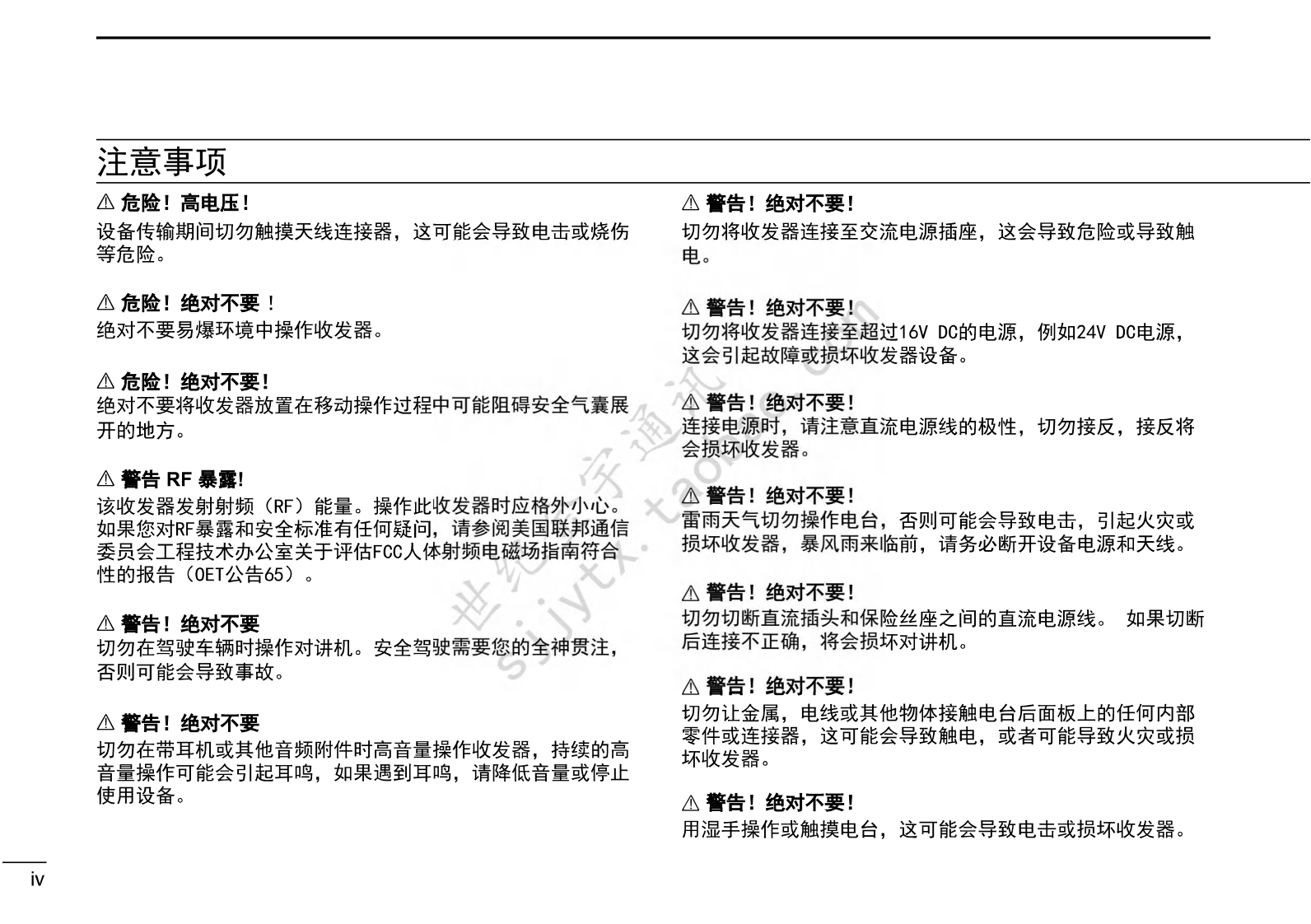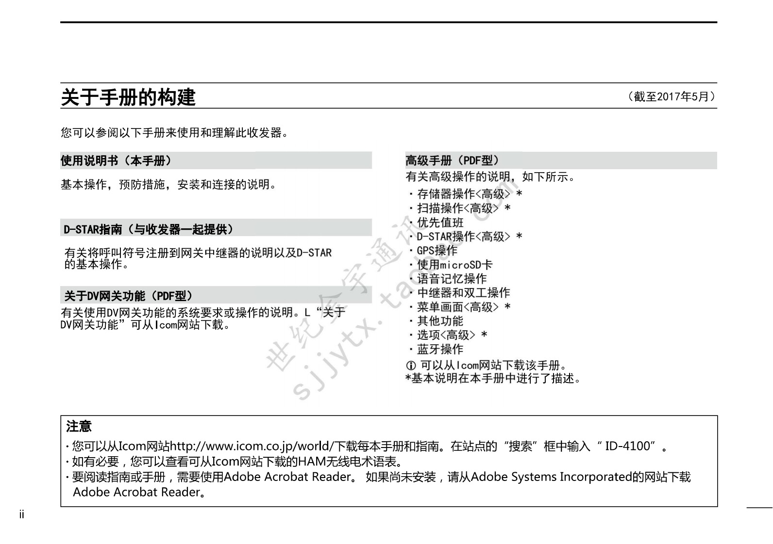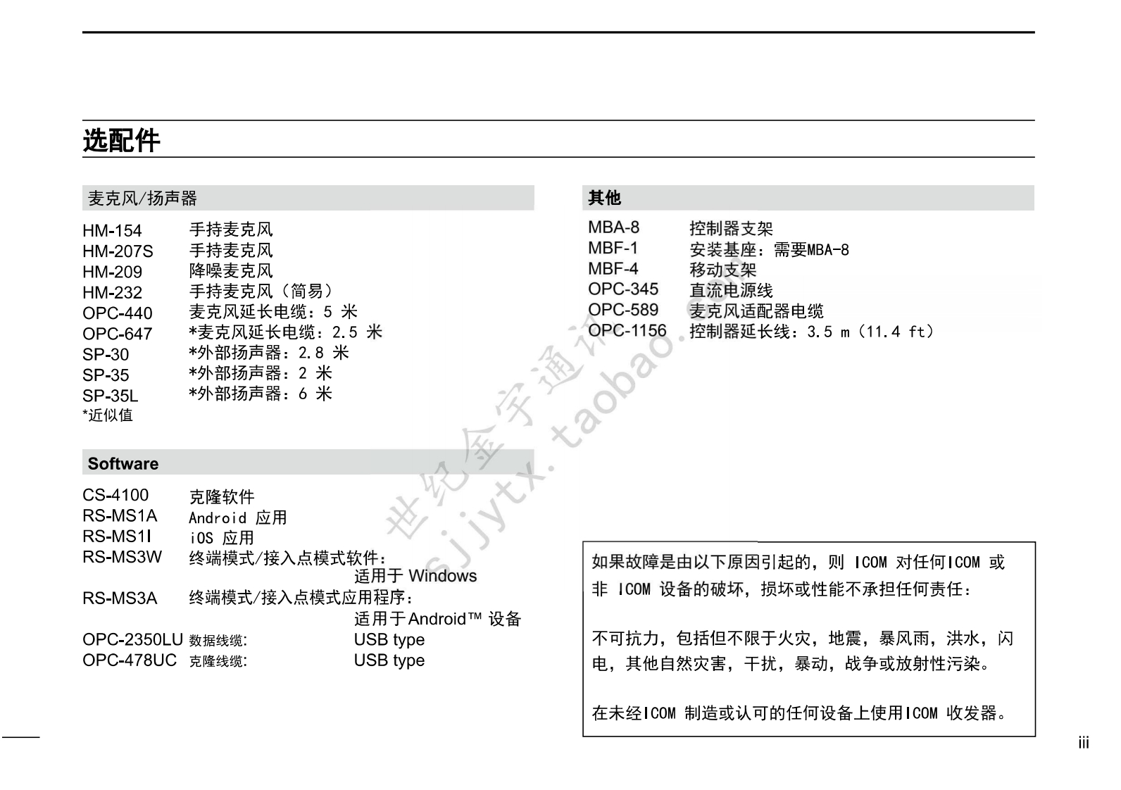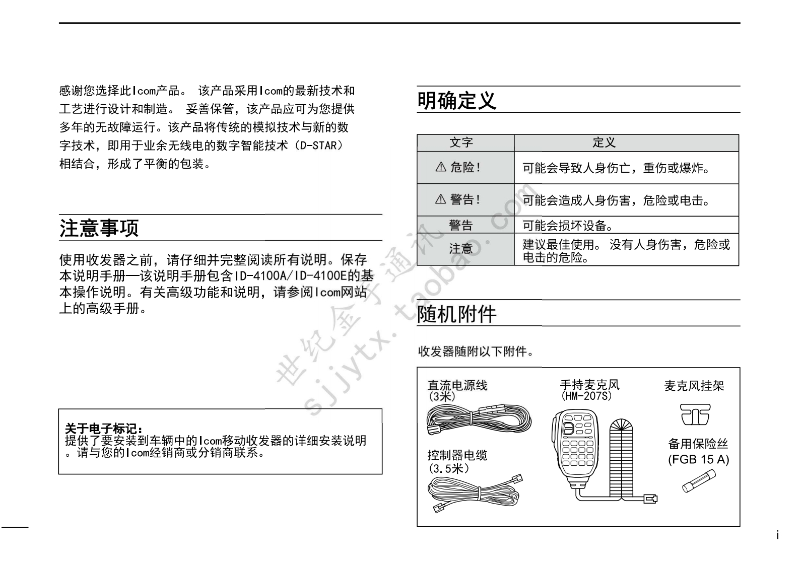 icOM使用说明书双频段收发车载电台回回世纪金宇通讯ID-4100E)iytx.taobao.comKirkland (IA)443575B此设备符合FCC规则的第15部分。,操作必须符合以下两个条件:(1),此设备不会造成有害千扰,并且(2)此设备必须接受收到的任何干扰,包括可能导致意外操作的干扰。警告:根据FCC规则和联邦法律,禁止修改此设备以接收CELL的无线电话服务信号。Icom Inc.