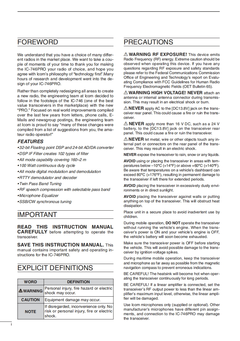 iCOMINSTRUCTION MANUALHFNHFALL MODE TRANSCEIVER1以.195.0IC-746PRO999“99常1国This device complies with Part 15 of the FCC rules.Operation is subject to the following two conditions:(1)This device may not causeharmful interference,and (2)this device must accept amy inte rferencereceived,induding interfe rence that may cause undesired operation.Icom Inc.