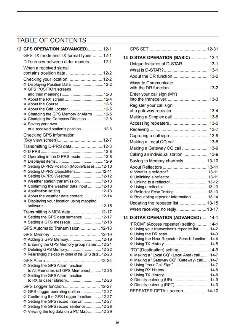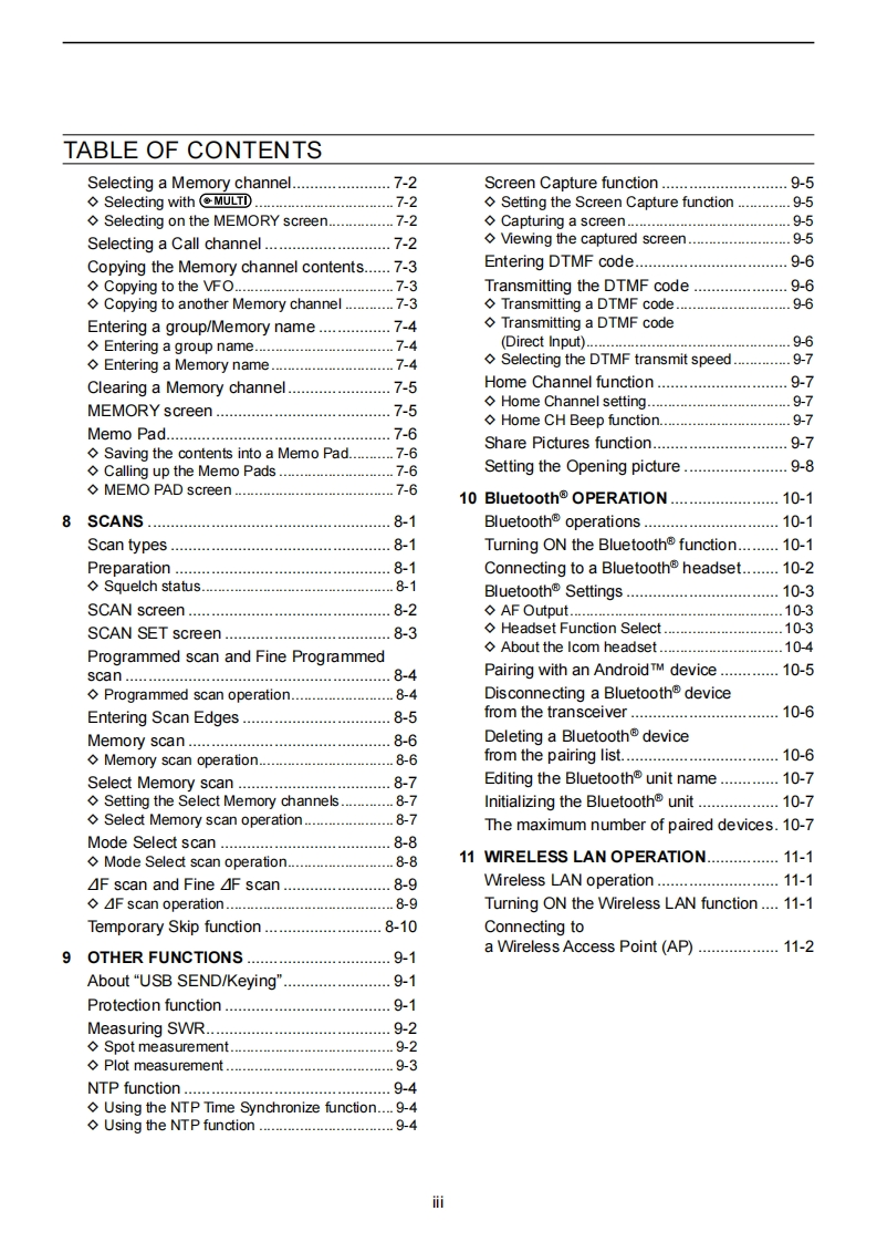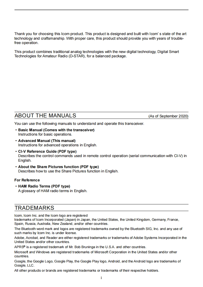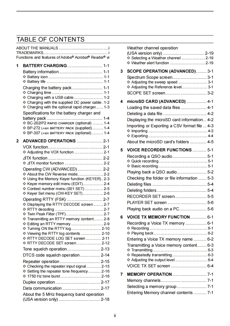 @cOMADVANCED MANUALHFNHF/UHF ALL MODEINTRODUCTIONTRANSCEIVER1C-7051BATTERY CHARGING2ADVANCED OPERATIONS3SCOPE OPERATION (ADVANCED)4microSD CARD (ADVANCED)5 VOICE RECORDER FUNCTIONS6VOICE TX MEMORY FUNCTION7MEMORY OPERATION8 SCANS9 OTHER FUNCTIONS10 Bluetooth OPERATIONThis manual describes instructions for advanced features andinstructions.11 WIRELESS LAN OPERATIONSee the BASIC MANUAL that come with the transceiver forprecaufions and basic operations.12 GPS OPERATION(ADVANCED)13 D-STAR OPERATION (BASIC)14 D-STAR OPERATION (ADVANCED)15 ABOUT THE DV GATEWAY FUNCTION16 MAINTENANCE(ADVANCED)17 UPDATING THE FIRMWAREIcom Inc.18 ADVANCED CONNECTIONS
