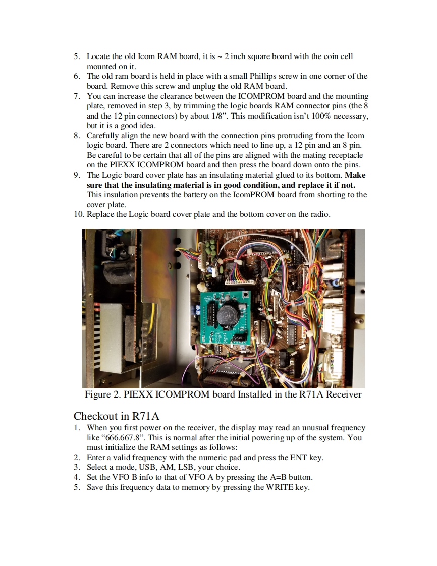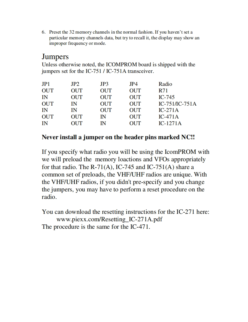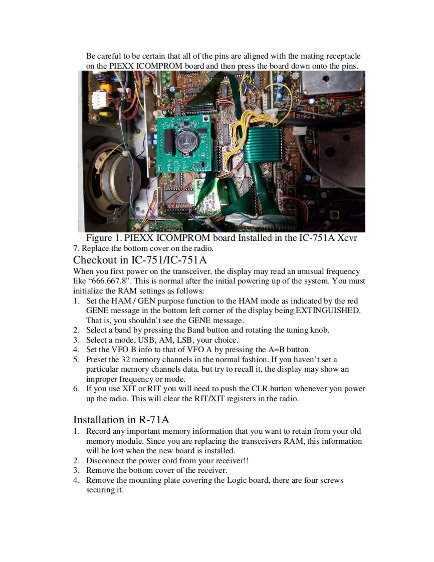 PIEXX ICOMPROMIC-751 /IC-751A RAM/PROM Memory BoardIf you have a Icom IC-751 or IC-751A transceiver you probably know that when theintemal battery gets weak the transceiver stops working!PIEXX has corrected thisproblem with the new ICOMPROM Ram replacement board.The ICOMPROM boardis a new,plug compatible,memory module that keeps the important setup informationin an onboard non-volatile PROM device while employing a battery backed RAM forsaving the memory channel data.With the PlEXX ICOMPROM board you will neverneed to worry about your transceiver going dead from a low battery again!R12U5PIEXXHillsboro,NHIcomPROMRev 2KU3ii过3VBATBT1R71(A)NONE45JP1JP1.JP3Installation in IC-751 IC-751A1.Record any important memory information that you want to retain from your oldmemory module.Since you are replacing the transceivers RAM,this informationwill be lost when the new board is installed.2.Disconnect the power cord from your transceiver!!3.Remove the bottom cover of the transceiver.4.Locate the old Icom RAM board,it is ~2 inch square board with the coin cellmounted on it.5.The old ram board is held in place with a small Phillips screw in one corner of theboard.Remove this screw and unplug the old RAM board.6.Carefully align the new board with the connection pins protruding from the Icomlogic board.There are 2 connectors which need to line up,a 12 pin and an 8 pin.