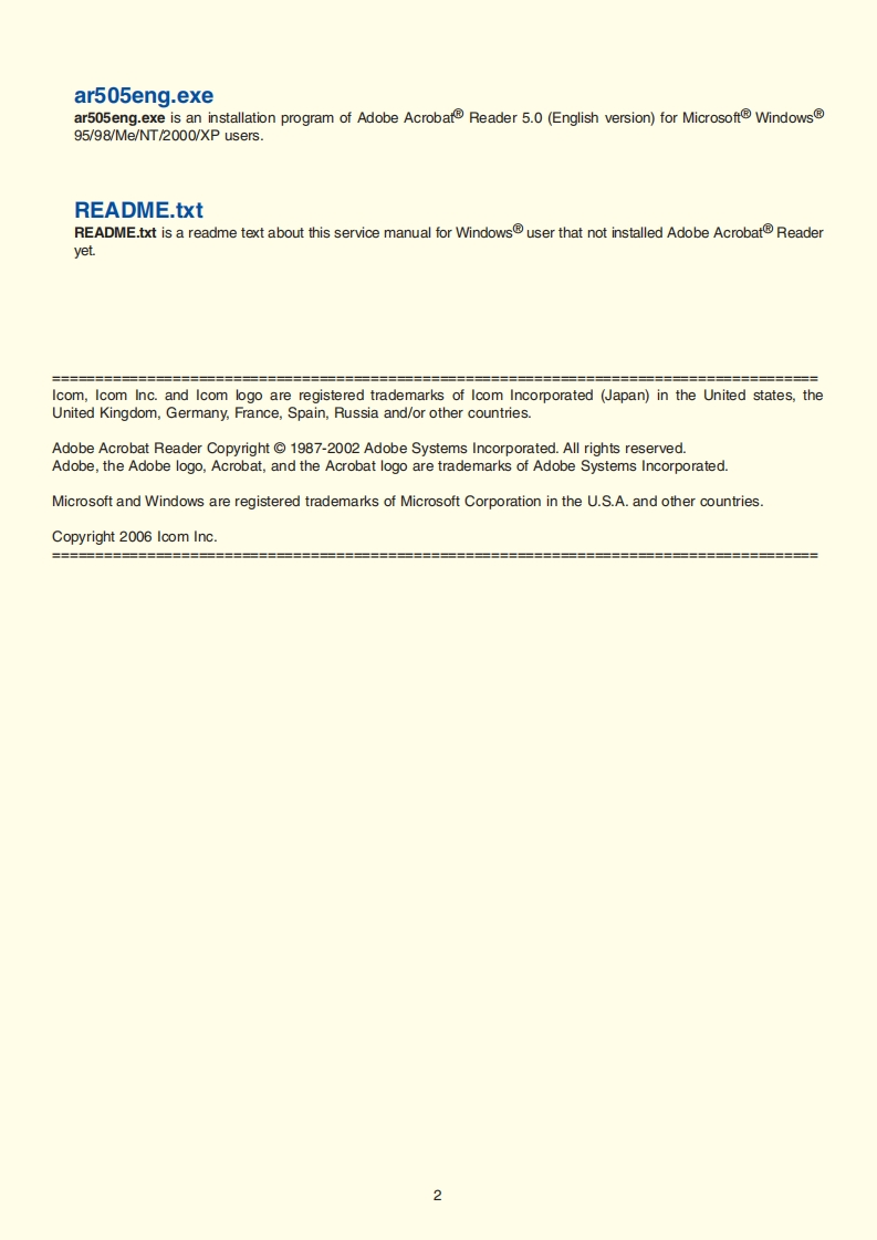 GUIDE FOR CD1)COMPOSIONPCR1500_2500PCR1500_2500.pdfFYCPCR1500 2500 A3format.pdfPCR1500_2500_A4format.pdfPCR1500_2500_MANUAL.pdfInstallerar505eng.exeREADME.txt2)DESCRIPTIONPCR15002500.pdfThe service manual for IC-PCR1500 and IC-PCR2500 including all service information in this CD.This file is mainly usedfor viewing on the computer display and checking page order to make printed service manual.Or when you want to find acomponent,you can find very fast using "FIND"function (except Board Layouts).PCR1500_2500_A3format.pdfConsists of A3 format pages (Board layouts,Mechanical parts and disassembly,and etc.).This file is used forprinting out A3 format pages.PCR1500 2500 A4format.pdfConsists of A4 format pages (Board layouts,Mechanical parts and disassembly,and etc.).This file is used forprinting out A4 format pages.PCR1500_2500_MANUAL.pdfThe instruction manual for IC-PCR1500 and IC-PCR2500.The contents of this file is exactly same as suppliedinstruction manual with product and consists of all A4 format pages.If you have A4 format printer,you can printand make brand new instruction manual any time you want.This file is also very helpful when you want to changeor set product setting condition for adjustment or else.1