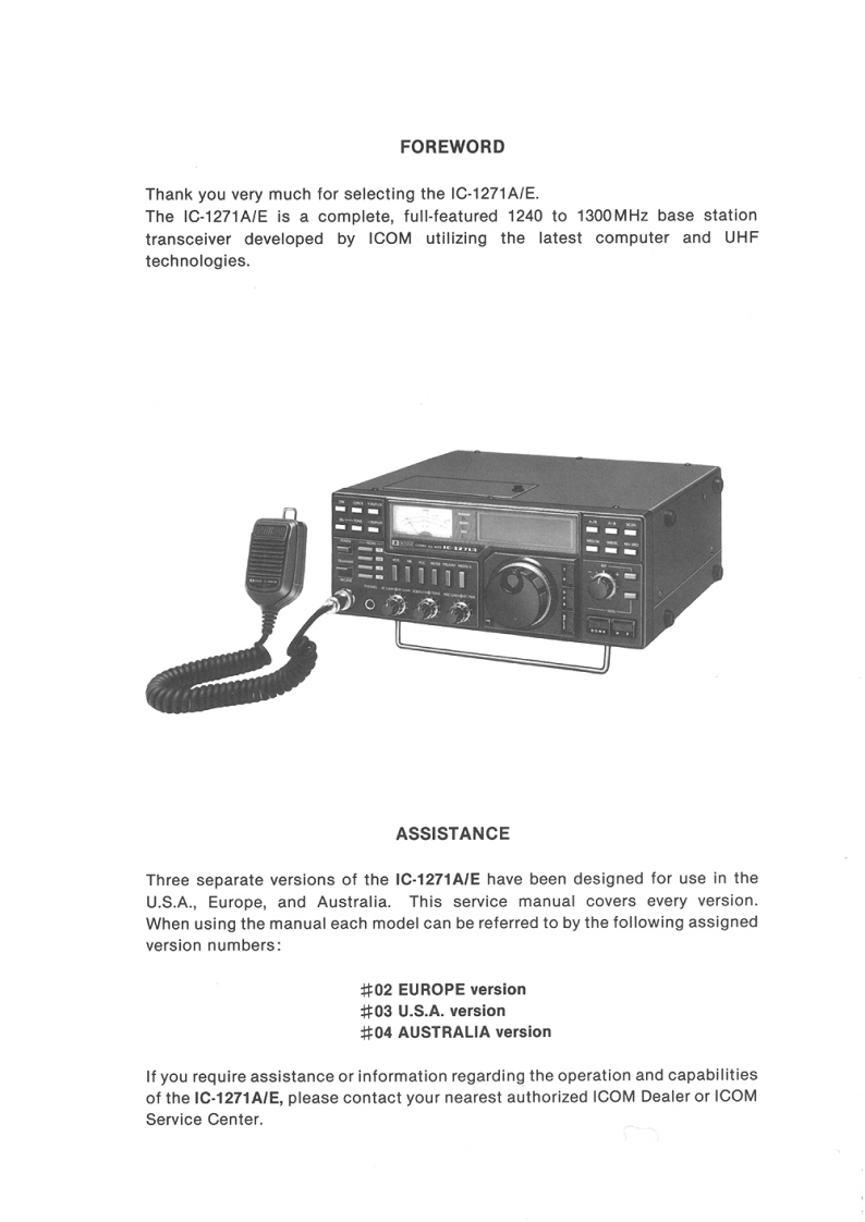 1200MHZ ALL MODE TRANSCEIVERC-27A/ESERVICEMANUALlICOMICOM INCORPORATED1-8-19,Kamikuratsukurl,Hirano-ku,Osaka 547,JapanFa:0793-0013ICOM AMERICA,INC.,ICOM (EUROPE)GmbH,6019wA96e084NEHimmelgelster Strasse 100.4000 DOsseldorf 1.Ph0n8:200458155West GermanyTelex:230-152210 ICOM AMER BVUEPh0n8:0211-346047Fax:2089454-1509TesK:41-8588062IC0MDFax:0211-333839Ste 126.ICOM AUSTRALIA,PTY.,LTD.,Phone:214550-75257 Duke Street,Windsor 3181.Fx:21与550-7423Victoria,AustrallaPh0ne:003喲52975821777 Phoenix Parkway,Suite 201.Telex:71-35521 ICOMASFax:035298485ICOM CANADA,LTD.,3071-#5 Road,Unit 9.Richmond.B.C.,VBX 2T4 CanadaPhon0:B0402737400Fx:04273-1900