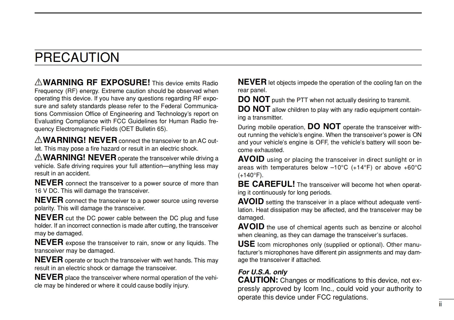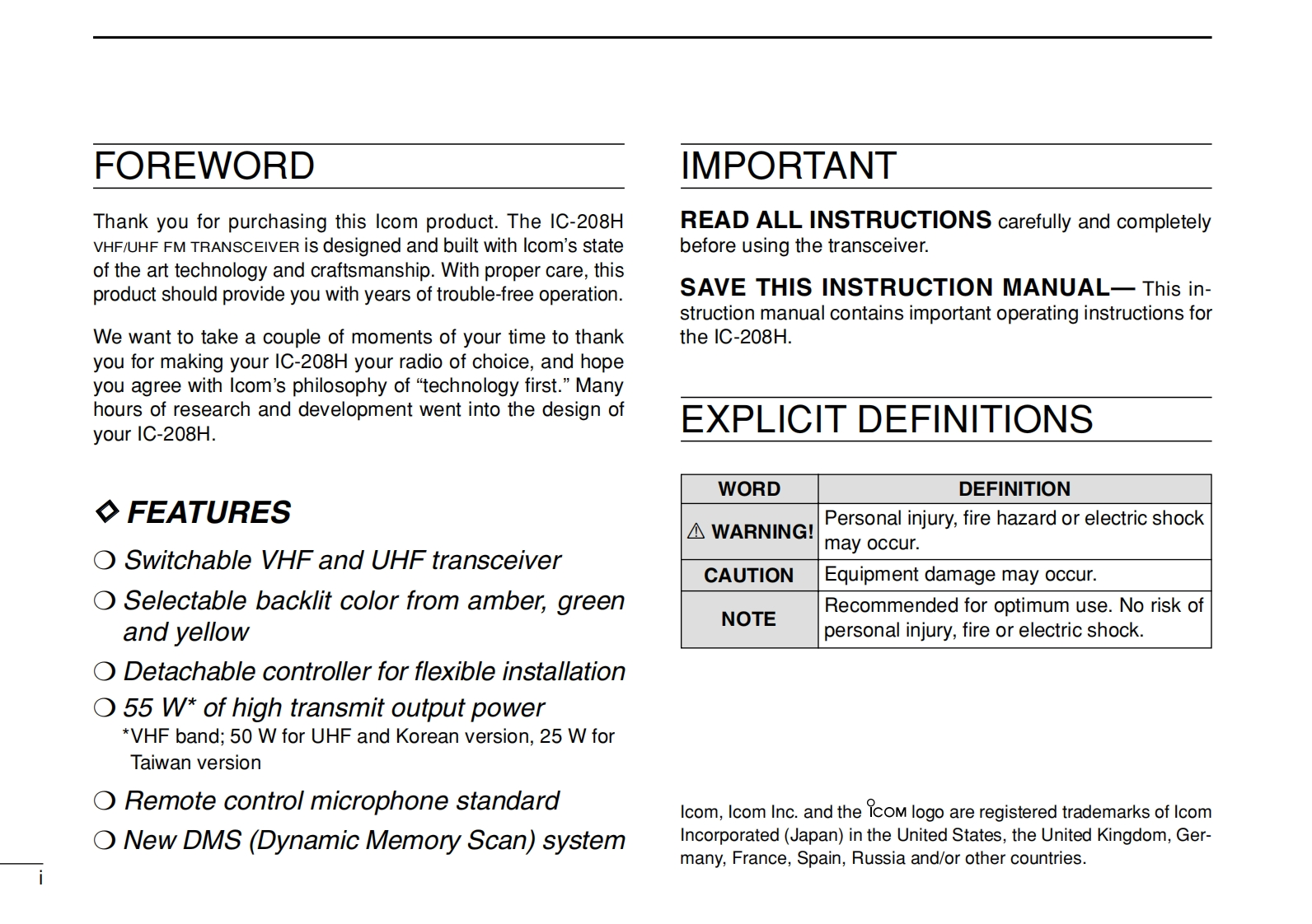 COM⊙INSTRUCTION MANUALVHF/UHF FM TRANSCEIVER1C-208H"6820BANDCSICIINI CThis device complies with Part 15 of the FCC rules.Operation is sub-ject to the following two conditions:(1)This device may not causeharmful interference,and(2)this device must accept any interferencereceived,including interference that may cause undesired operation.Icom Inc.
