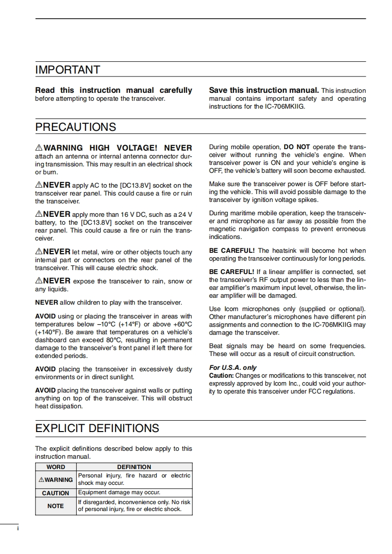 IcomINSTRUCTION MANUALHF/VHF/UHF ALL MODE TRANSCEIVERIC-7O6MKIΠGThis device complies with Part 15 of the FCC rules.Opera fion is sub-ject o the following two condfons:(1)This device may not causeharmful intedference,and 2)this device must accept any interferencereceived,including inte dference that may cause undesired operafion.Icom Inc.