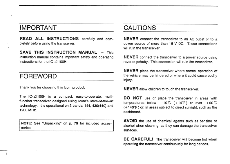 ICOMINSTRUCTION MANUALTRIBAND FM TRANSCEIVERIC-100H1:550011¥388001i29350This device compies with Part 15 of the FCC Rules.Operation issubject to the foilowing two condtions:(1)This device may not causeharmful intererence,and (2)this device must accept any interferencerecelved,including interference that may cause undesired operation.Icom Inc.