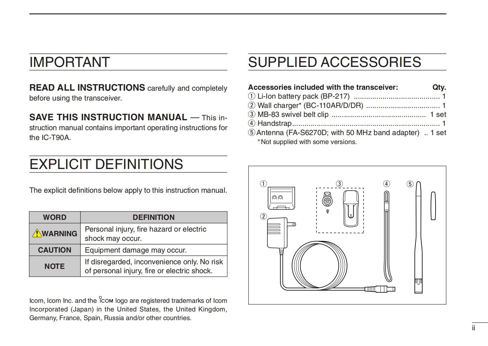 COMINSTRUCTION MANUALMULTIBAND FM TRANSCEIVERIC-T9OAiCOMThis device complies with Part 15 of the FCC Rules.Operation is sub-45.6009扇ject to the following two conditions:(1)This device may not causeLow aEEEaEEtdeharmful interference,and(2)this device must accept any interferenceMULTIBAND TRANSCEIVERreceived,including interference that may cause undesired operationWARNING:MODIFICATION OF THIS DEVICE TO RECEIVE CEL-LULAR RADIO TELEPHONE SERVICE SIGNALS IS PROHIBITEDUNDER FCC RULES AND FEDERAL LAW品8&品品恩Icom Inc.思盟