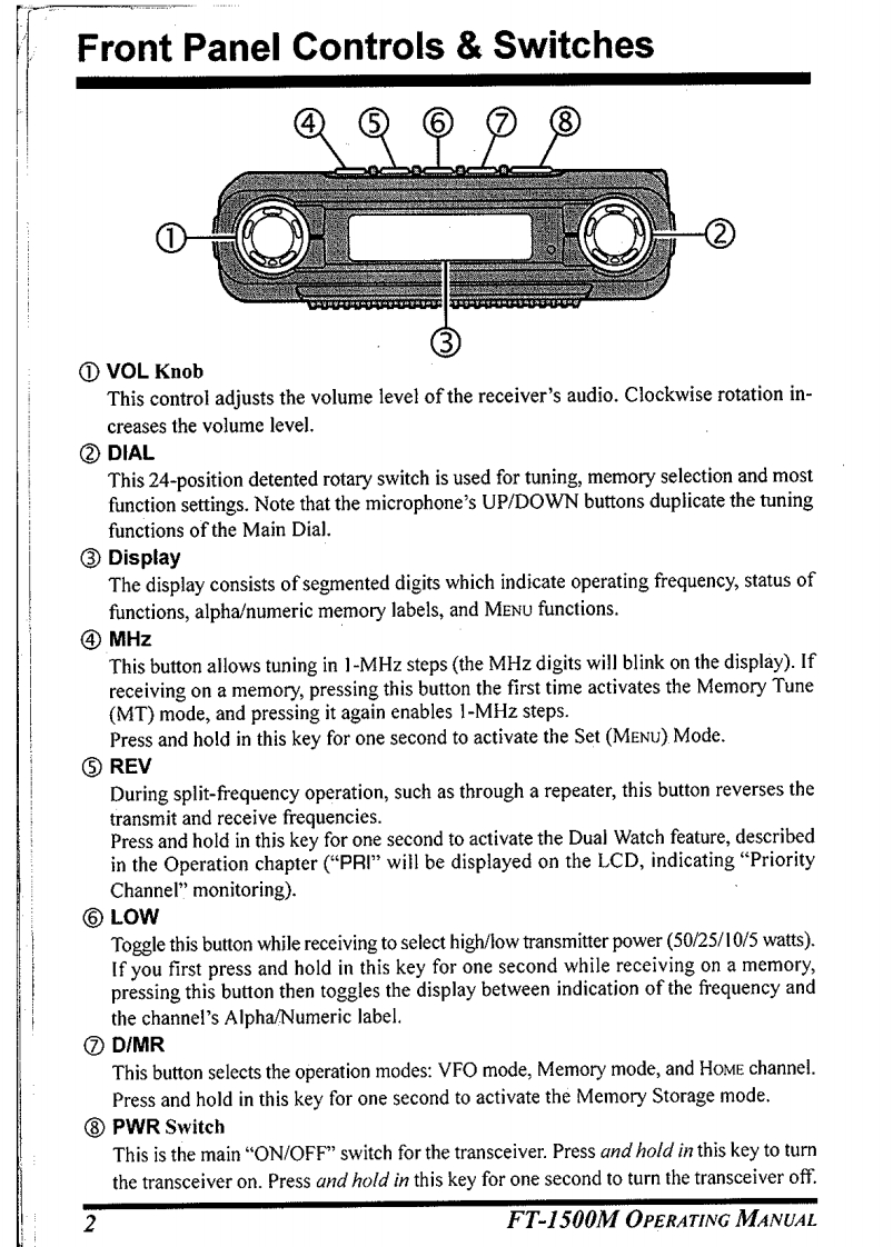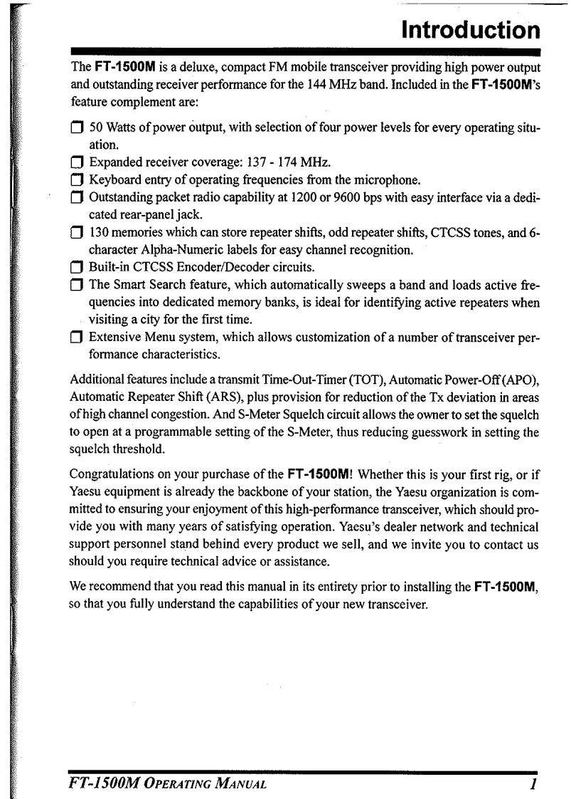 FM TRANSCEIVERFT-1500MOPERATING MANUALVERTEX STANDARD CO.,LTD.4-8-8 Nakameguro,Meguro-Ku,Tokyo 153-8644,JapanVERTEX STANDARDUS Headquarters10900.Walker Street,Cypress,CA 90630,U.S.A.International Division8350 N.W.52nd Terrace,Suite 201,Miami,FL 33166,U.S.A.YAESU EUROPE B.V.P.O.Box 75525,1118 ZN Schiphol,The NetherlandsYAESU UK LTD.Unit 12,Sun Valley Business Park,Winnall CloseWinchester,Hampshire,SO23 OLB,U.K.VERTEX STANDARD HK LTD.Scanned by IW5DBz▣Unit 5,20/F.,Seaview Centre,139-141 Hoi Bun Road,▣Kwun Tong,Kowloon,Hong KongDownloaded by▣Amateur Radio Directory·*