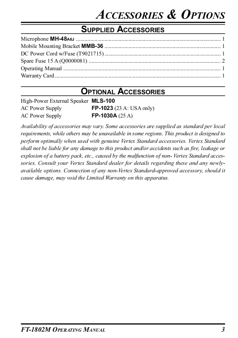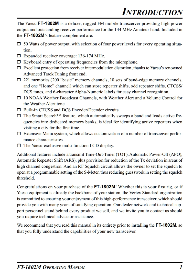 YAESUFM TRANSCEIVERFT-1802MOPERATING MANUAL115E2099VERTEX STANDARD CO.,LTD.4-8-8 Nakameguro,Meguro-Ku,Tokyo 153-8644,JapanVERTEX STANDARDUS Headquarters10900 Walker Street,Cypress,CA 90630,U.S.A.YAESU EUROPE B.V.P.O.Box 75525,1118 ZN Schiphol,The NetherlandsYAESU UK LTD.Unit 12,Sun Valley Business Park,Winnall CloseWinchester,Hampshire,S023 0LB,U.K.VERTEX STANDARD HK LTDUnit 5,20/F.,Seaview Centre,139-141 Hoi Bun Road,Kwun Tong,Kowloon,Hong Kong