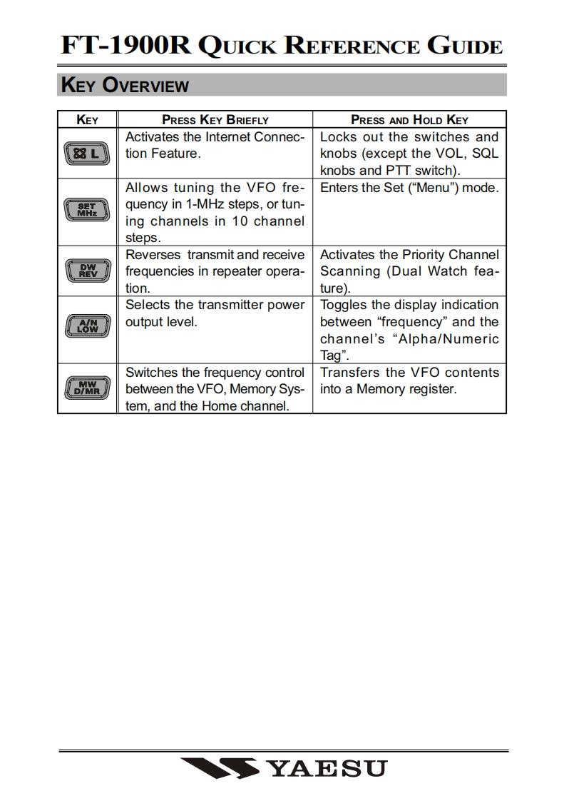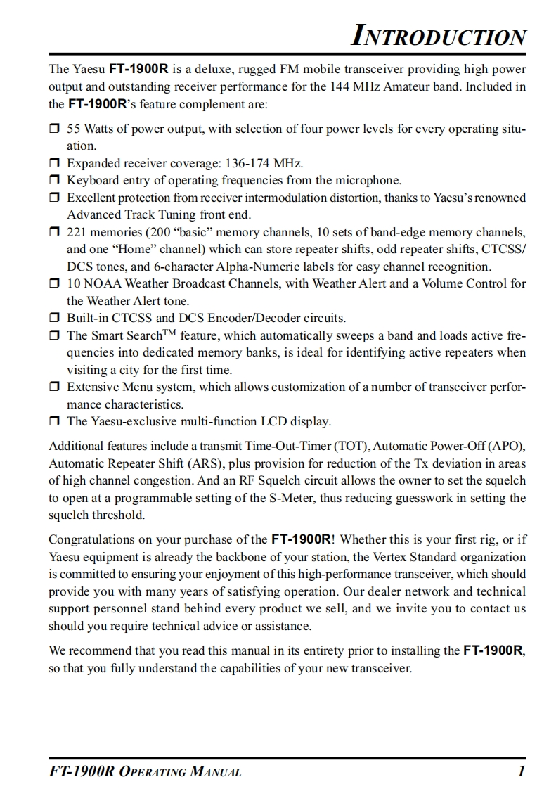 YAESUFM TRANSCEIVERFT-1900ROPERATING MANUAL食品m55项☑199VERTEX STANDARD CO.,LTD4-8-8 Nakameguro,Meguro-Ku,Tokyo 153-8644,JapanVERTEX STANDARDUS Headquarters10900 Walker Street,Cypress,CA 90630,U.S.AYAESU UK LTD.Unit 12,Sun Valley Business Park,Winnall CloseWinchester,Hampshire.SO23 OLB.U.K.VERTEX STANDARD HK LTD.Unit 5,20/F.,Seaview Centre,139-141 Hoi Bun Road,Kwun Tong.Kowloon,Hong KongVERTEX STANDARD(AUSTRALIA)PTY.,LTDNormanby Business Park,Unit 14/45 Normanby RoadNotting Hill 3168,Victoria,Australia