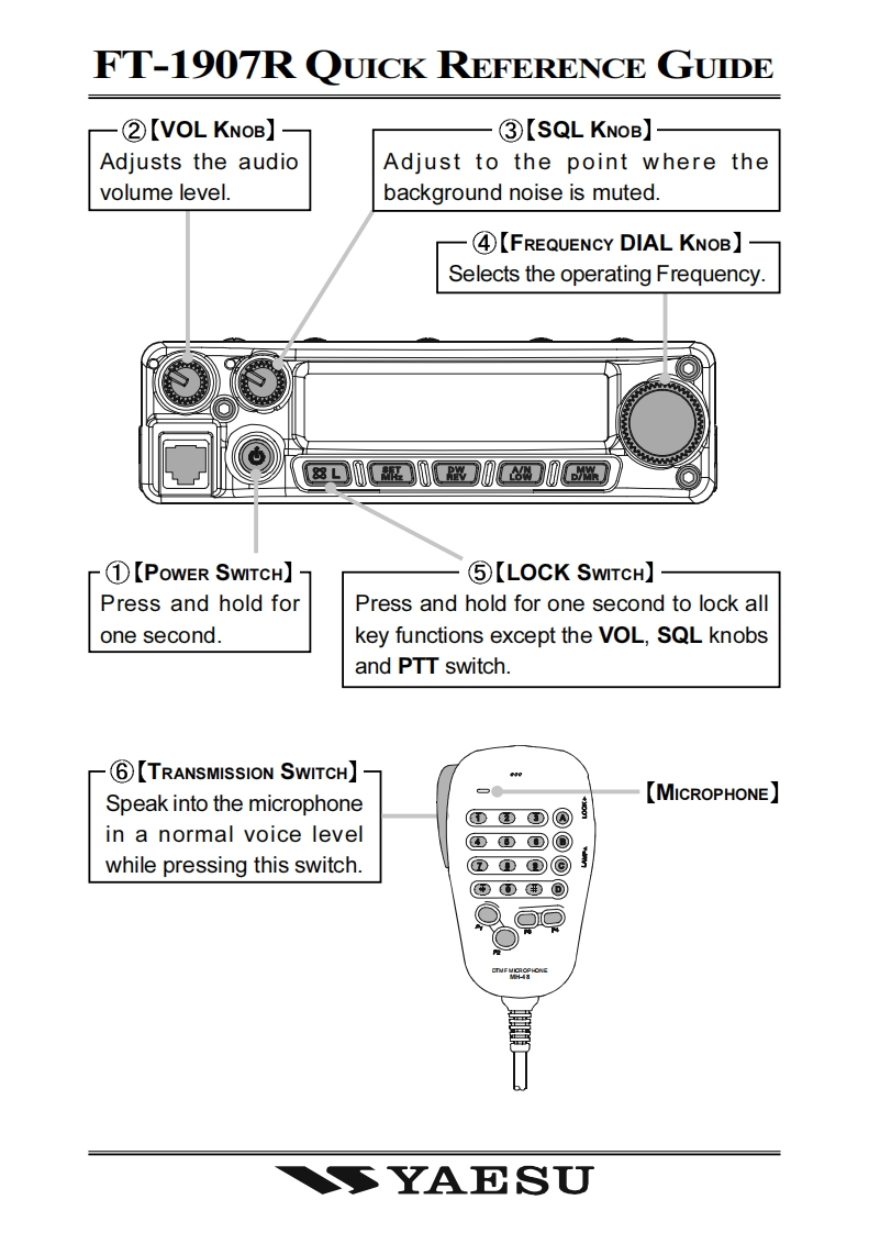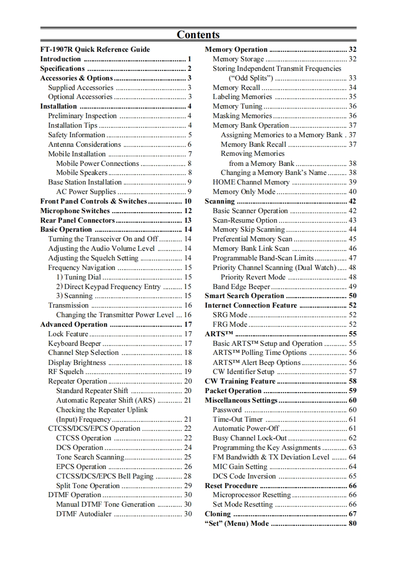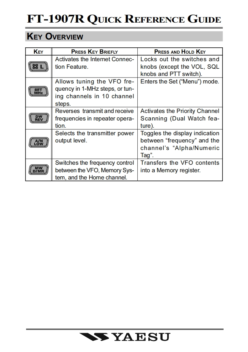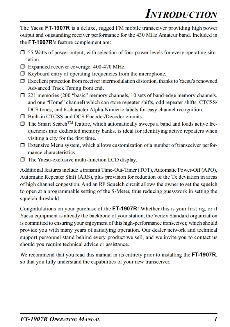SYAESUFM TRANSCEIVERFT-1907ROPERATING MANUAL43300099VERTEX STANDARD CO.,LTD4-8-8 Nakameguro,Meguro-Ku,Tokyo 153-8644,JapanVERTEX STANDARDUS Headquarters10900 Walker Street,Cypress,CA 90630,U.S.AYAESU UK LTD.Unit 12.Sun Valley Business Park,Winnall CloseWinchester.Hampshire.SO23 OLB.U.K.VERTEX STANDARD HK LTDUnit 1306-1308,13F.,Millennium City 2,378 Kwun Tong Road,Kwun Tong,Kowloon,Hong KongVERTEX STANDARD(AUSTRALIA)PTY.,LTD.Tally Ho Business Park,10 Wesley Court,East Burwood,VIC,3151
