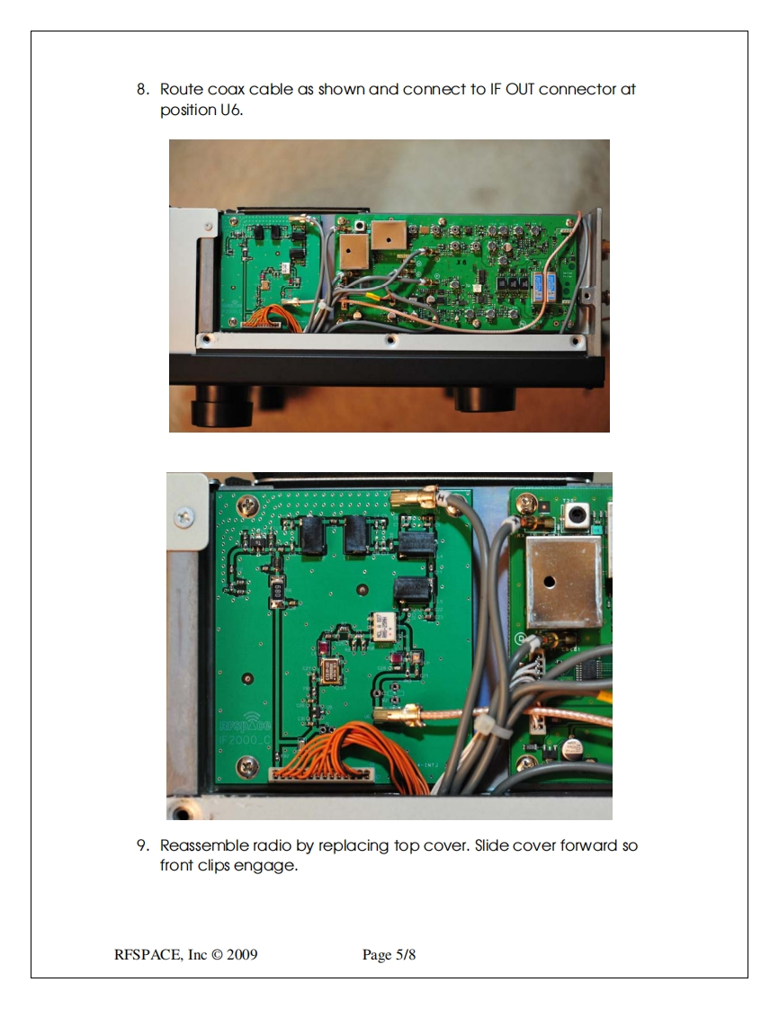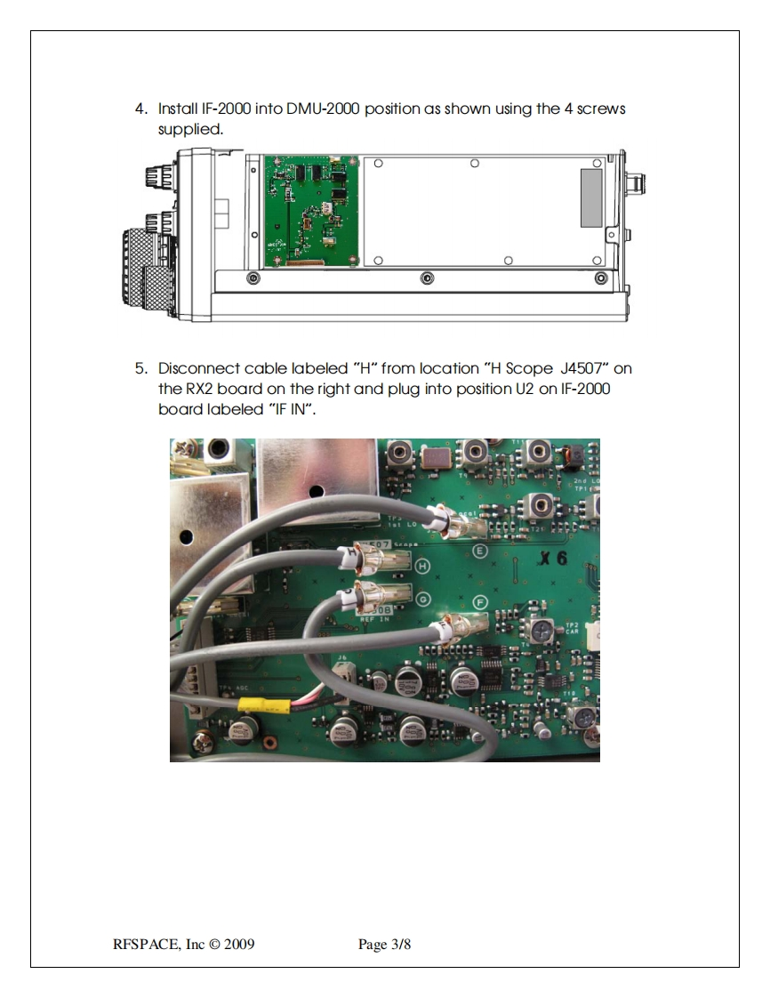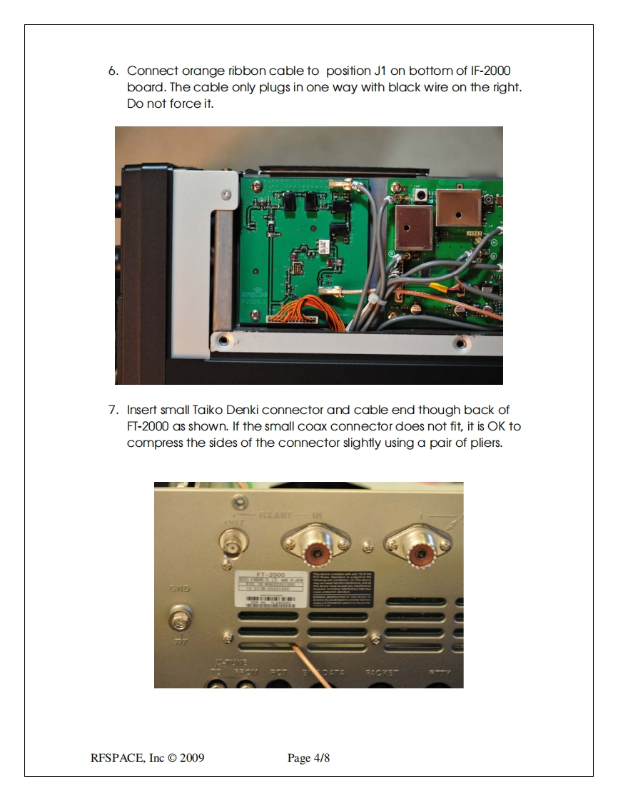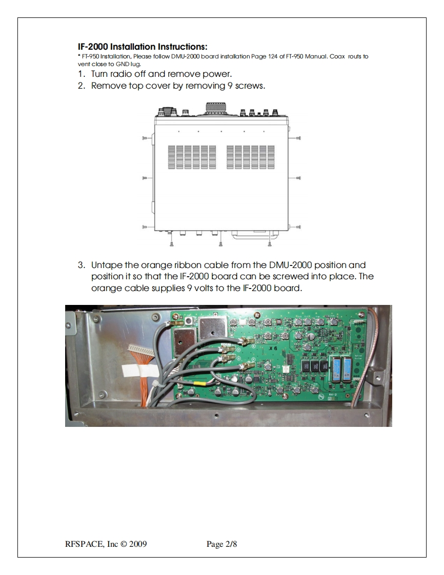 RFsp金ceP.0Box191231Atlanta,GA 31119-1231info@rfspace.comIF-2000 Rev C.IF interface boardVersion2.2The IF-2000 Revision-C IF interface boardadds an IF output at 10.55 MHz to the Yaesumodel FT-2000 and FT-950 transceivers.This board allows the interfacing of thetransceiver to an RFSPACE SDR orpanoramic adapter.The addition of an SDR tothe Yaesu radios greatly enhances itscapabilities.F2000.0Here are some of the key enhancements of the RFSPACE SDR-IQ/IF-2000 board:1.Adds the most powerful panoramic adapter available for the Yaesu radios.Experience unprecedented speed,bandwidth and resolution.2.Adds a 190 KHz wide waterfall/spectrum display.3.Adds two additional AMFM/CW/SSB demodulators4.Allows the recording of 190 KHz of band to the computer hard drive centered atthe radio VFO frequency.5.Allows the monitoring of HF and 6 meter frequencies6.Adds the ability to monitor the transmitter spectrum.IF-2000 Specifications:Current Draw:110mA@9 voltsLO Frequency:80.000MHzLO Stability:+/50ppm,0->+85CIF Input:69.45MHzIF Output:10.55MHzResponse:+/0.5dB@+/-500KHzInput Return Loss:-20dBThe FT-2000 and FT-950 radios change IF frequencies depending on mode selected and programmedcarrier offset frequencies.RFSPACE,Inc©2009Page 1/8