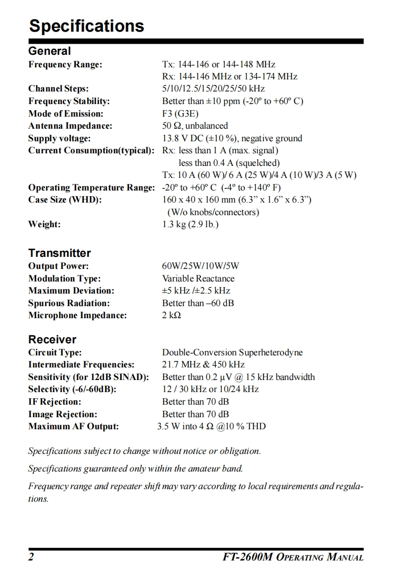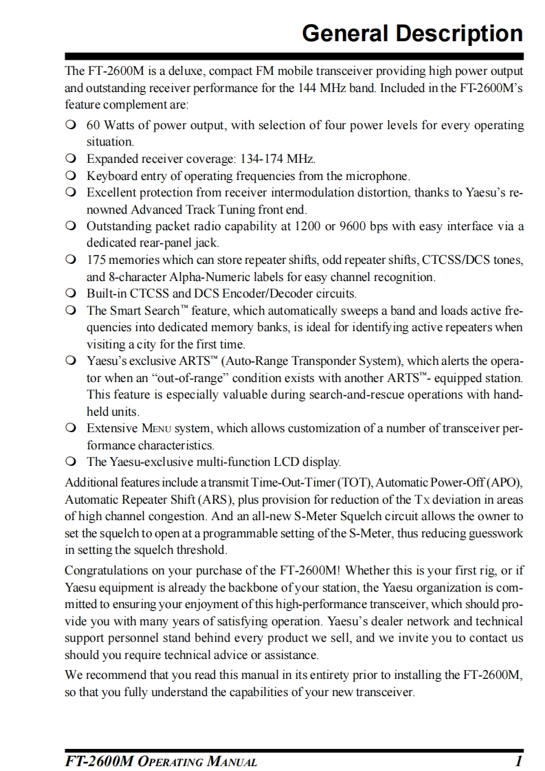YAESU144 MHz BAND FM TRANSCEIVERFT-2600MOPERATING MANUAL200AN0画YADSUVERTEX STANDARD CO.,LTD4-8-8 Nakameguro,Meguro-Ku,Tokyo 153-8644,JapanVERTEX STANDARDUS Headquarters17210 Edwards Rd.,Cerritos,CA 90703,U.S.A.International Division8350 N.W.52nd Terrace,Suite 201,Miami,FL 33166,U.S.A.YAESU EUROPE B.V.P.O.Box 75525,1118 ZN Schiphol,The NetherlandsYAESU UK LTD.Unit 12,Sun Valley Business Park,Winnall CloseWinchester,Hampshire,S023 0LB,U.K.VERTEX STANDARD HK LTD.Unit 5,20/F.,Seaview Centre,139-141 Hoi Bun Road,Kwun Tong,Kowloon,Hong Kong
