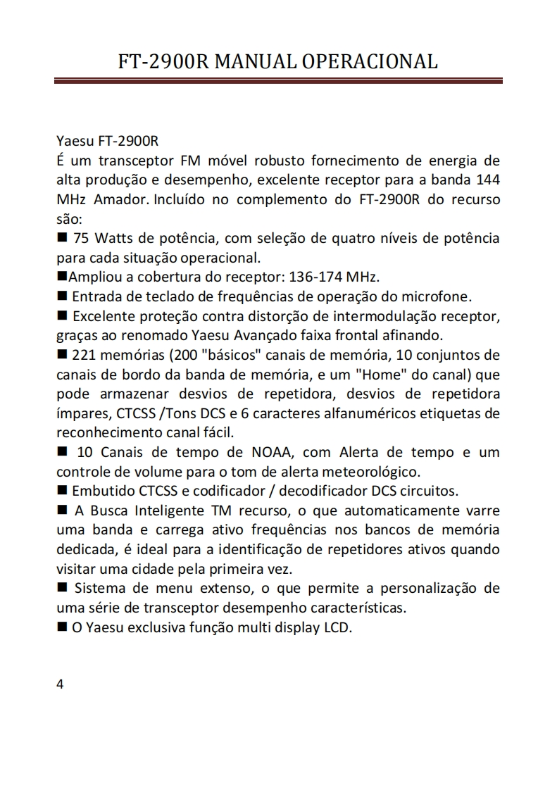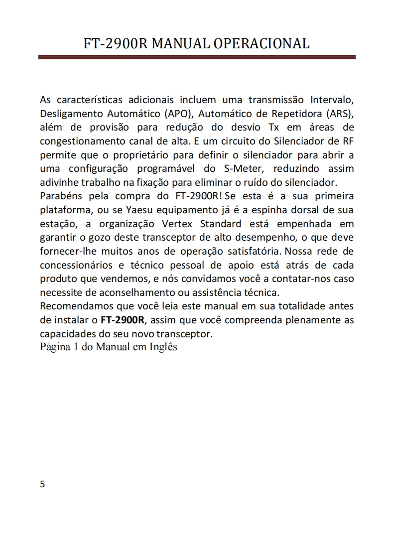 FT-2900R MANUAL OPERACIONALFT-2900RE MANUAL OPERACIONALVertex Standard Co.LTD.4-8-8 Nakameguro,Meguro-ku,Tokyo 153-8644,Japao VERTEX652093STANDARD Sede nos EUA 10900 WalkerStreet,Cypress,CA 90630,EUA YAESU UKLTD.Unidade 12,Vale do Sol Business Park,Winnall Fechar Winchester,Hampshire,SO23 OLB,Reino UnidoVERTEX STANDARD HK LTD.Unidade 5,20/F.,Seaview Centro,139-141 Hoi Bun Road,Kwun Tong,Kowloon,Hong Kong VERTEXSTANDARD (AUSTRALIA)PTY,LTD.Normanby Business Park,Unidade 14/45 Estrada Normanby Notting Hill 3168,Victoria,Australia.