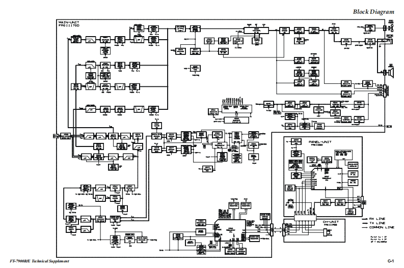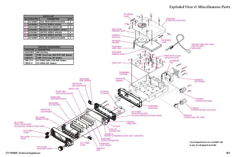 YAESUVERTEX STANDARD CO.,LTD.4-8-8 Nakameguro,Meguro-Ku,Tokyo 153-8644,JapanDual Band FM TransceiverVERTEX STANDARDUS Headquarters10900 Walker Street,Cypress,CA90630,U.S.A.YAESU UK LTD.FT-7900R/EWheClVERTEX STANDARD HK LTD.Technical Supplement.37 kwun Tong RoadVERTEX STANDARD (AUSTRALIA)PTY.,LTD.Tally Ho Business Park,10 Wesley Court,East Burwood,VIC,31512011 VERTEX STANDARD CO.,LTD.EH016M93B1300006UY■■】IntroductionThis manual provides technical information necessary for servicing the FT-7900R/E Transceiver.Servicing this equipment requires expertise in handling surface-mount chip components.Attempts by non-qualifiedpersons to service this equipment may result in permanent damage not covered by the warranty,and may be illegal insome countries.Two PCB layout diagrams are provided for each double-sided circuit board in the transceiver.Each side of thr board isreferred to by the type of the majority of components installed on that side("leaded"or"chip-only").In most cases oneside has only chip components,and the other has either a mixture of both chip and leaded components(trimmers,coils,electrolytic capacitors,ICs,etc.),or leaded components only.While we believe the technical information in this manual to be correct,Vertex Standard assumes no liability for dam-age that may occur as a result of typographical or other errors that may be present.Your cooperation in pointing out anyinconsistencies in the technical information would be appreciated.Important NoteThe transceiver was assembled using Pb(lead)free solder,based on the RoHS specification.Only lead-free solder(Alloy Composition:Sn-3.0Ag-0.5Cu)should be used for repairs performed on this appara-tus.The solder stated above utilizes the alloy composition required for compliance with the lead-free specifica-tion,and any solder with the above alloy composition may be used.ContentsSpecifications…A-1Board Unit(Schematics,Layouts Parts)Exploded View Miscellaneous Parts .....B-1MAIN Unit........F-lBlock Diagram...........C-1PANEL UnitG-1Circuit Description.......D-1CHUnitH-1Alignment ..............E-1