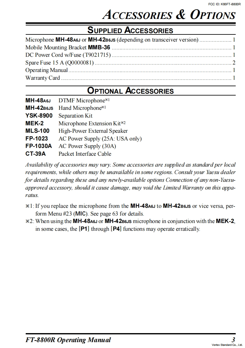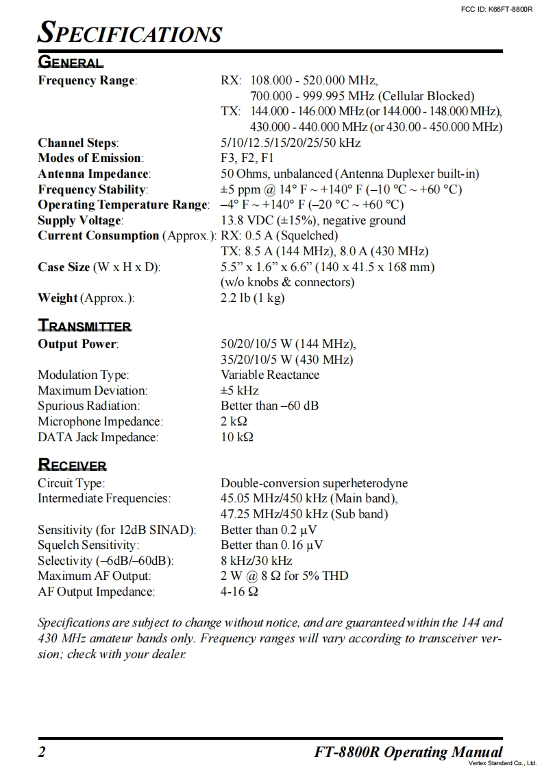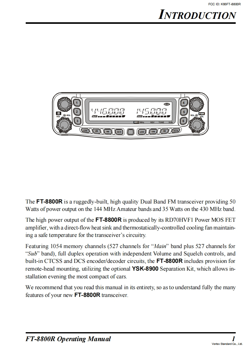 FCC ID:K66FT-8800RYAESUDUAL BAND FM TRANSCEIVERFT-8800ROPERATING MANUAL。e00o。@0oo。⊙。oD⊙SB0060G8VERTEX STANDARD CO.,LTD4-8-8 Nakameguro,Meguro-Ku,Tokyo 153-8644,JapanVERTEX STANDARDUS Headquarters10900 Walker Street,Cypress,CA 90630,U.S.A.International Division8350 N.W.52nd Terrace,Suite 201,Miami,FL 33166,U.S.AYAESU EUROPE B.V.P.O.Box 75525,1118 ZN Schiphol,The NetherlandsYAESU UK LTD.Unit 12,Sun Valley Business Park,Winnall CloseWinchester,Hampshire,SO23 0LB,U.K.VERTEX STANDARD HK LTD.Unit 5,20/F.,Seaview Centre,139-141 Hoi Bun Road,Kwun Tong,Kowloon,Hong KongVertex Standard Co.,Lid.