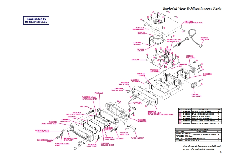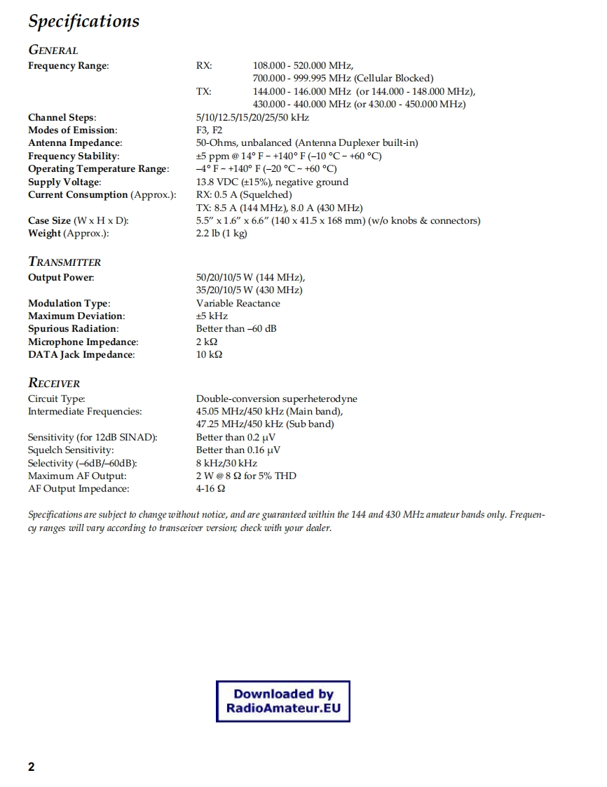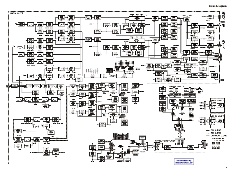 YAESUVERTEX STANDARD CO.,LTD.4-8-8 Nakameguro,Meguro-Ku,Tokyo 153-8644,JapanVERTEX STANDARDUS HeadquartersDual Band FM Transceiver10900 Walker Street,Cypress,CA 90630,U.S.A.International Division8350 N.W.52nd Terrace.Suite 201.Miami.FL 33166.U.S.A.FT-8800RYAESU EUROPE B.V.P.O.Box 75525,1118 ZN Schiphol.The NetherlandsYAESU UK LTD.Technical SupplementUnit 12,Sun Valley Business Park,Winnall CloseWinchester,Hampshire,SO23 OLB,U.K.VERTEX STANDARD HK LTD.2003 VERTEX STANDARD CO.,LTDEH018M90A)Unit 5,20/F.,Seaview Centre,139-141 Hoi Bun Road,Kwun Tong,Kowloon,Hong Kong5团。■■■■■■■■田。■=■■■■■TONEIntroductionThis manual provides technical information necessary for servicing the FT-8800R Transceiver.Servicing this equipment requires expertise in handling surface-mount chip components.Attempts by non-qualifiedpersons to service this equipment may result in permanent damage not covered by the warranty,and may be illegal insome countries.Two PCB layout diagrams are provided for each double-sided circuit board in the transceiver.Each side of thr board isreferred to by the type of the majority of components installed on that side("leaded"or "chip-only").In most cases oneside has only chip components,and the other has either a mixture of both chip and leaded components(trimmers,coils,electrolytic capacitors,ICs,etc.),or leaded components only.While we believe the technical information in this manual to be correct,Vertex Standard assumes no liability for dam-age that may occur as a result of typographical or other errors that may be present.Your cooperation in pointing out anyinconsistencies in the technical information would be appreciated.ContentsSpecifications .......…2Board Unit (Schematics,Layouts Parts)Exploded View Miscellaneous Parts .........3Main Unit17Block Diagram.........5Panel Unit..5Circuit Description......Panel-Sub Unit577VR-L Unit53Alignment .........11VR-R Unit..54Downloaded byRadioAmateur.EU