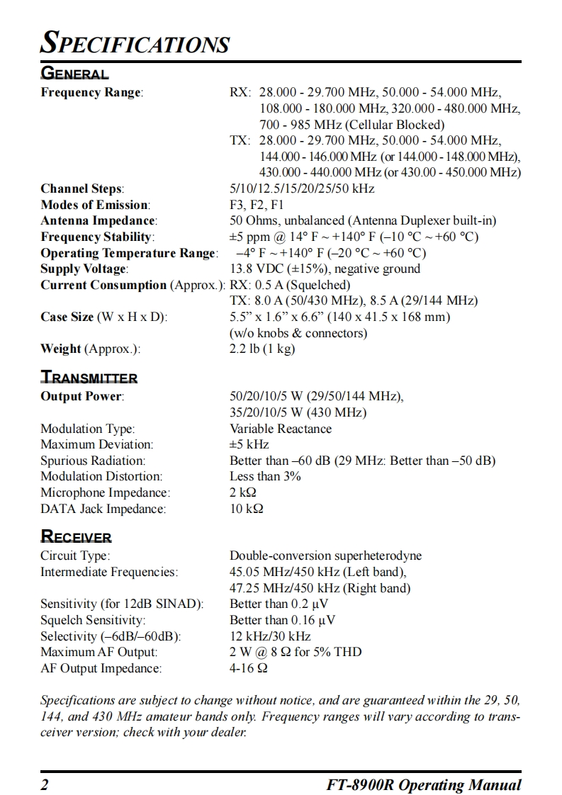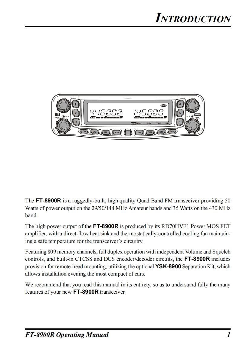 YAESUQUAD BAND FM TRANSCEIVERFT-8900ROPERATING MANUALoe0oooo0o。go@D⊙5B00460G8VERTEX STANDARD CO.,LTD.4-8-8 Nakameguro,Meguro-Ku,Tokyo 153-8644,JapanVERTEX STANDARDUS Headquarters10900 Walker Street,Cypress,CA 90630,U.S.A.International Division8350 N.W.52nd Terrace,Suite 201,Miami,FL 33166,U.S.A.YAESU EUROPE B.V.P.O.Box 75525,1118 ZN Schiphol,The NetherlandsYAESU UK LTD.Unit 12,Sun Valley Business Park,Winnall CloseWinchester,Hampshire,S023 0LB,U.K.VERTEX STANDARD HK LTD.Unit 5,20/F.,Seaview Centre,139-141 Hoi Bun Road,Kwun Tong,Kowloon,Hong Kong
