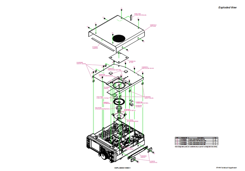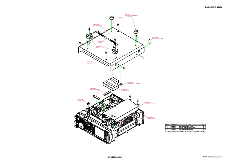 YAESUTechnical SupplementThe radioHF/VHF/UHF ALL MODE TRANSCEIVERFT-991EHO57M90B2015 YAESU MUSEN CO..LTD.IntroductionContentsThis manual provides the technical information necessaryfor servicing the FT-991 HF/VHF/UHF ALL MODESpecificationsTRANSCEIVERExploded View Miscellaneous PartsServicing this equipment requires expertise in hand-Block Diagraming surface-mount chip components.Attempts by non-Connection Diagramqualified persons to service this equipment may resultAlignmentin permanent damage not covered by the warranty,andBoard Unit(Schematics,Layouts Parts)may be illegal in some countries.Two PCB layout diagrams provided for each double-MAIN Unitsided board in this transceiver.Each side of the boardPLL Unitis referred to by the type of the majority of componentsEDSP Unitinstalled on that side ("Side A"or "Side B").In mostCNTL Unitcases one side has only chip components,and the otherHF-PA Unithas either a mixture of both chip and leaded componentsV_U-PA Unit(trimmers,coils,electrolytic capacitors,ICs,etc.),orleaded components only.PANEL UnitWhile we believe the information in this manual to beFAN-CNTL Unitcorrect,YAESU assumes no liability for damage thatTUNER Unitmay occur as a result of typographical or other errorsJACK Unitthat may be present.Your cooperation in pointing outDSP Unitany inconsistencies in the technical information wouldbe appreciated.Important NoteThis transceiver was assembled using Pb(lead)free solder,based on the RoHS specification.Only lead-free solder(Alloy Composition:Sn-3.0Ag-0.5Cu)should be used for repairs performed on this apparatus.The solder statedabove utilizes the alloy composition required for compliance with the lead-free specification,and any solder with the above alloy com-position may be used.CautionRisk ofexplosion if battery is replaced by an incorrect type.Dispose of used batteries according to the instructions.