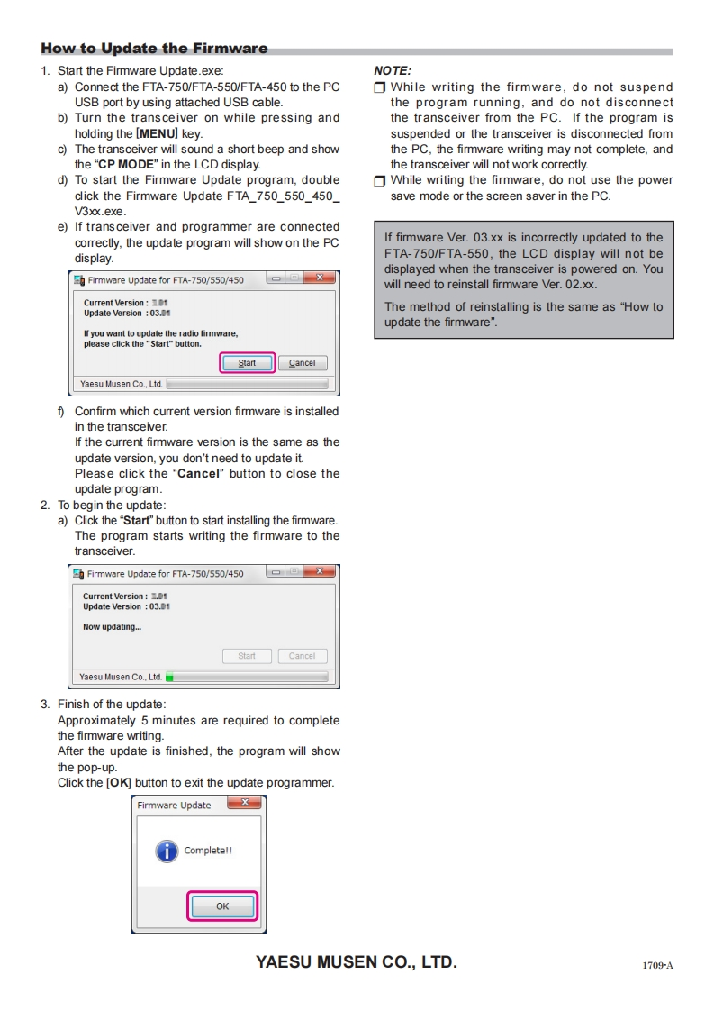 How to update the FTA-750/FTA-550/FTA-450 seriesTo update the FTA-750/FTA-550/FTA-450 series,the following files are needed.a)Firmware Update FTA_750_550_450_V3xx.exe Firmware Update fileb)YCE01 V2.0.0.4 or higherProgramming Softwarec)Upchk.exeRadio Update check fileCaution!Run the (Upchk.exe)diagnostic program to determine whether your FTA-750/FTA-550 can be updated tofirmware version (Ver.03.xx).Installing the Device DriverHow to check the new firmware possibilityThe FTA-750/FTA-550/FTA-450 device driver must beNote:FTA-450 does not require this check,proceed toinstalled on your PC before starting the firmware update."How to Update the Firmware"on the next page.1.Download the YCE01 PC Programming Software1.Tum the transceiver on.from the YAESU website and decompress the files2.Connect the computer to the transceivers DATAjackto anywhere on your computer.Note that all the filesusing the USB Cable(T9101606)supplied with themust remain in the same folder.FTA-750/FTA-550,as shown below.2.Run the "setup.exe"in the same folder that you havedecompressed the files.3.Follow the instructions on your computer screenIf the YCE01 is successfully installed,a shortcuticon "YCE01"will appear on the desktop of yourcomputer.The instruction screen for installing theUSB CableFTA-750/FTA-550/FTA-450 device driver will alsoFTA750/FTA550appear.4.Follow the instructions on your computer screen.The device driver will be installed.3.To start the Update Check program (Upchk.exe),double click the Upchk.exe.4.Click the [Start]button.Updste check programYAESUFTA-750/550 Firmware Update Checkers010Modol:7??Exit Peogramadio Fimware Verdon:x.Start主家#d代5.After few second,the program will show the modelname,firmware version and result.6.If the program shows"Firmware update is available.",thetransceiver can updated to the firmware version 03.xx.YAESUFTA-750/550 Firmware Update Checker Wnsion 14Modol:FTA-750Radio Fimware Version:2.06StartResult:Firmware update is available.If the program shows the result "Firmware updateis not available.".In this case,do not update tofirmware version 03.xx.Updating the firmware,mayresult in the transceiver not operating properly.Update check proram回YAESUFTA-750/550 Firmware Update CheckerWergion 1.0Mod址:FA-750Radio Firwere Version:2.06Result:Firmware update is not available.