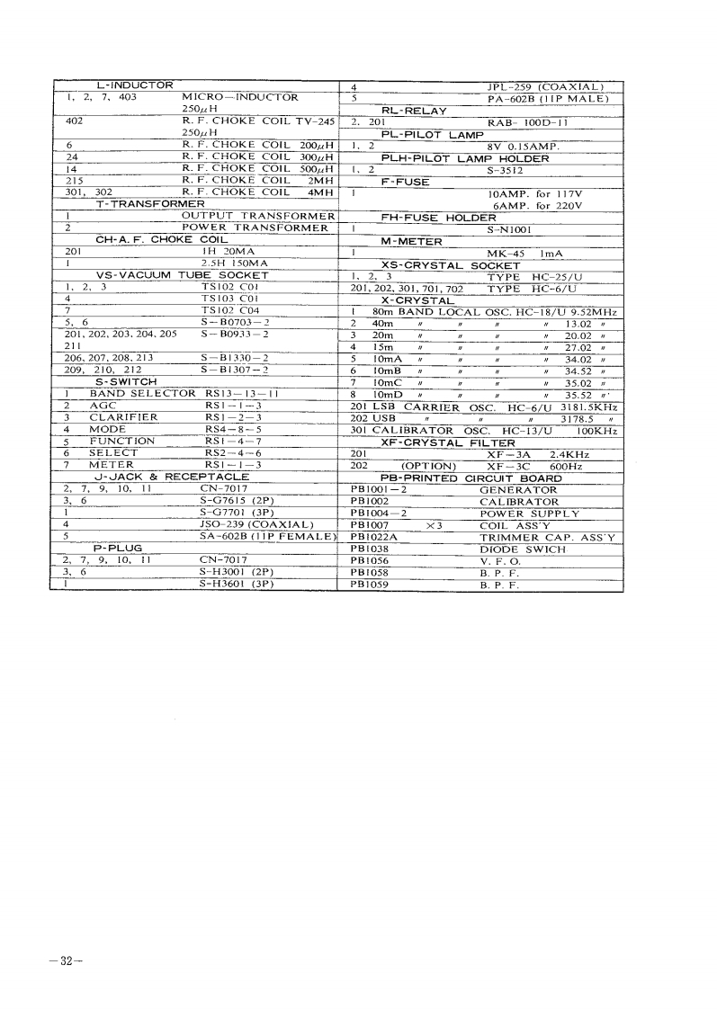 7分低周波增幅平衡变洞中間周波塔幅第1混合D3.184c3.18Mc12AX77360永昌71儿98A66CB6第1凳振12AU79.2LSB 3.1815Mc8.7McUS8:3.1785Mc第2凳振锾衝增幅锻衡增幅緩衙增幅9.29.2-2SC3729.23SK222SK196BAS8.7Mc8.7Mc8.7Mc9.2-8.7Mc6.02-5.52Mc第2混合励振增幅電力增幅3.53.5-29.7Mc6AH66GK68KD6×230Mc9.52Mc(3.5Mc带)】50Mc凿两電鍵第3凳振13.02Mc(7Mc带)6BA620.02Mc(14Mc常)】27.02Mc(21Mc带)第3混合励振增幅34.02Mc(28Me带A)150T34.52Mc(28Mc带B}1/2-6AW8A12BY7A35.02Mc(28Mc带C)35.52Mc〔28Mc带D50-54McFTV650在粗合世石場合第4凳振電力增幅1住点粮部分在高力ㄝ(記厂一1/2-6A3A【一S2001-入方马二七22Mc(50Mc带A)24Mc(50Mc嵩B】FL2000B专组合世名場合励板增幅電力增幅笔力增幅仕热段部分专右网0女)6KD6X2572B×23.56GKS記入寸名二29.7McFL2500左粗合世名場合仕励援增幅花力增幅電力增幅终段部分花右☒)上氵已6GK66KD6X26KD6×5记入方名二北第13☒了了于ュ了局申請用7积以夕夕了少亏么-29