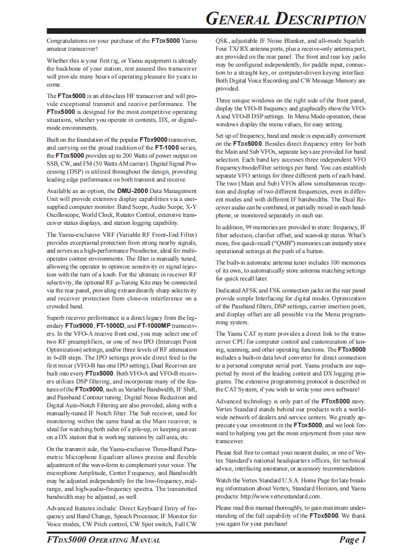 SSYAESUHF/50 MHZ TRANSCEIVERFTDX5000 SERIESOPERATINGMANUAL7-249500阳-a的VERTEX STANDARD CO.,LTD.4-8-8 Nakameguro,Meguro-Ku,Tokyo 153-8644,JapanVERTEX STANDARDUS Headquarters10900 Walker Street,Cypress,CA 90630,U.S.A.YAESU UK LTD.Unit 12,Sun Valley Business Park,Winnall CloseWinchester.Hampshire.SO23 OLB.U.K.VERTEX STANDARD HK LTD.Unit 5,20/F.,Seaview Centre,139-141 Hoi Bun Road,Kwun Tong,Kowloon,Hong KongVERTEX STANDARD(AUSTRALIA)PTY.,LTD.Normanby Business Park,Unit 14/45 Normanby RoadNotting Hill 3168.Victoria.Australia