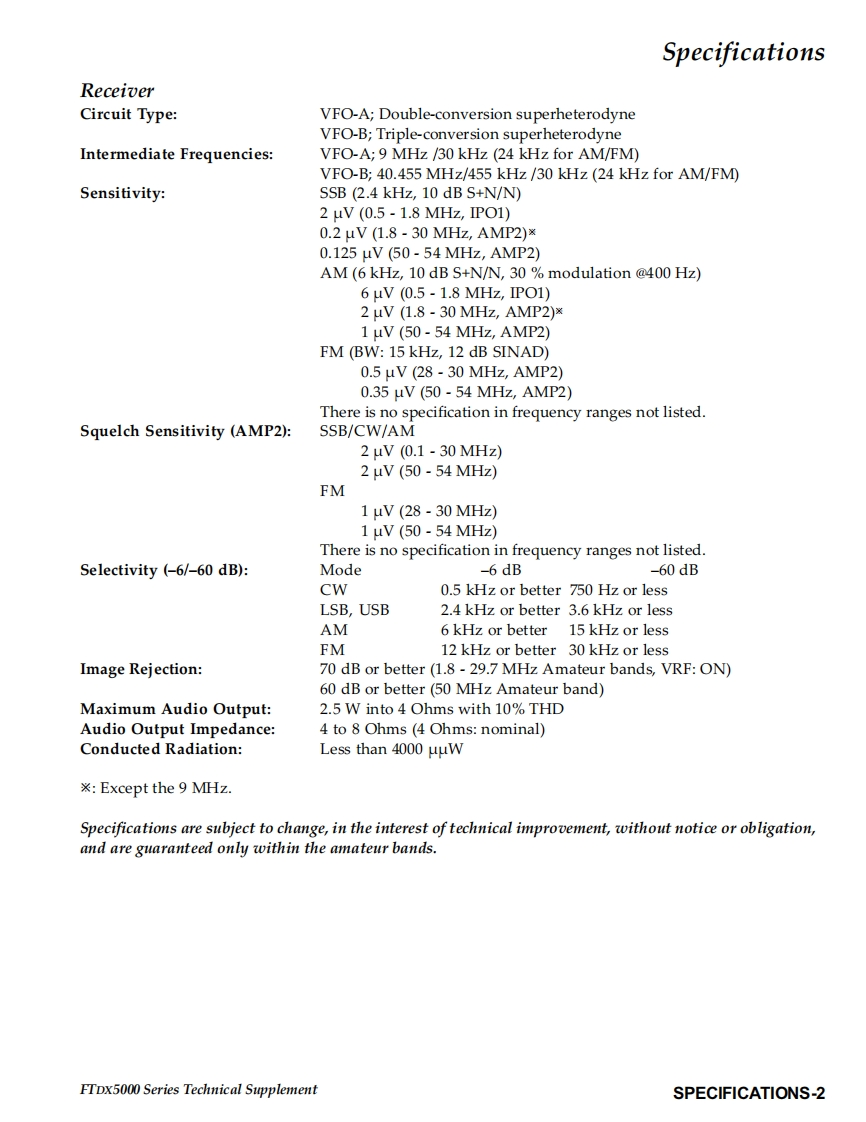 YAESUVERTEX STANDARD CO.,LTD.4-8-8 Nakameguro,Meguro-Ku,Tokyo 153-8644,JapanVERTEXSTANDARDUS HeadquartersHF/50 MHz TRANSCEIVER10900 Waiker Street,Cypress,CA 90630,U.S.A.YAESU UK LTD.Unit 12.Sun Valley Business Park,Winnall CloseFTDX5000SERIESWinchester,Hampshire,SO23 OLB,U.K.VERTEX STANDARD HK LTD.Unit 1306-1308,13F.,Millennium City 2,378 Kwun Tong Road,Kwun Tong,Kowloon,Hong KongTechnical SupplementVERTEX STANDARD(AUSTRALIA)PTY.,LTD.Tally Ho Business Park,10 Wesley Court,East Burwood,VIC,3151@2011 VERTEX STANDARD CO.,LTDEHO36H90CContents95000SpecificationsExploded View Miscellaneous PartsBlock DiagramConnection DiagramAlignmentBoard Unit(Schematics,Layouts Parts)IntroductionTRX UnitThis manual provides technical information necessary forVRF Unitservicing the FTDX5000 Series HF/50 MHz Transceiver.BPF UnitServicing this equipment requires expertise in handlingSCP Unitsurface-mount chip components.Attempts by non-qual-DVS Unitified persons to service this equipment may result inRX-1 Unitpermanent damage not covered by the warranty,andLOCAL Unitmay be illegal in some countries.CNTL UnitTwo PCB layout diagrams are provided for each dou-PA-B Unitble-sided circuit board in the Transceiver.Each side ofTUNER Unitis referred to by the type of the majority of componentsTUNER-C Unitinstalled on that side ("leaded"or "chip-only").In mostANT Unitcases one side has only chip components,and the oth-VRF-A Uniter has either a mixture of both chip and leaded compo-DSP Unitnents(trimmers,coils,electrolytic capacitors,ICs,etc.),VR-A Unitor leaded components only.VR-B UnitWhile we believe the technical information in this manu-ENC Unital to be correct,VERTEX STANDARD assumes no lia-BACK-LIGHT Unitbility for damage that may occur as a result of typograph-SW-A Unitical or other errors that may be present.Your coopera-SW-B Unittion in pointing out any inconsistencies in the technicalSW-C Unitinformation would be appreciated.SW-D UnitJACK UnitImportant NoteMIC Unit1)This transceiver was assembled using Pb (lead)free solder,UEL Unitbased on the RoHS specification.Only lead-free solder (Alloy Composition:Sn-3.0Ag-0.5Cu)LINK Unitshould be used for repairs performed on this apparatus.Thesolder stated above utilizes the alloy composition required forcompliance with the lead-free specification,and any solderwith the above alloy composition may be used.2)Risk ofexplosion if battery is replaced by an incorrect typeDispose of used batteries according to the instructions.