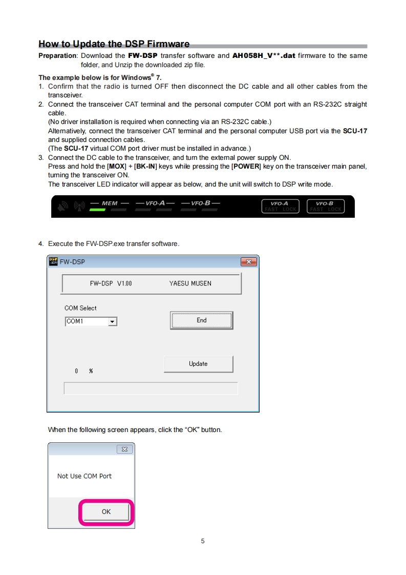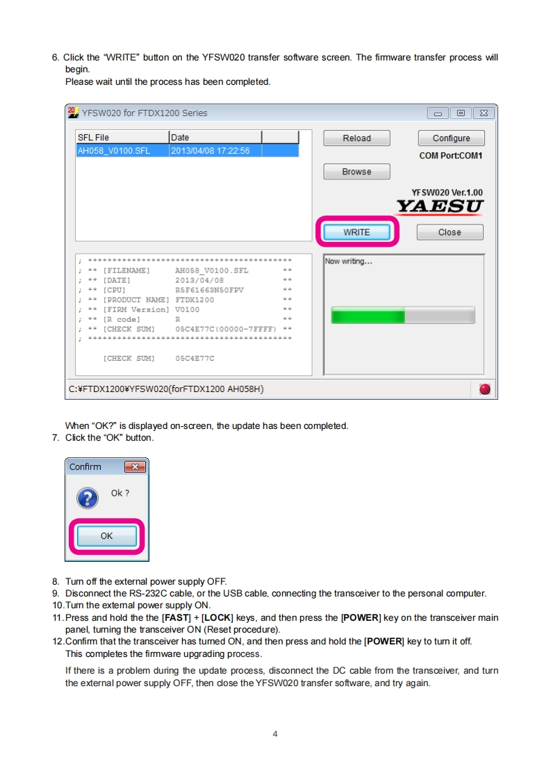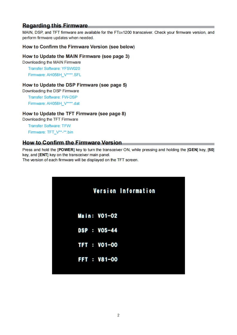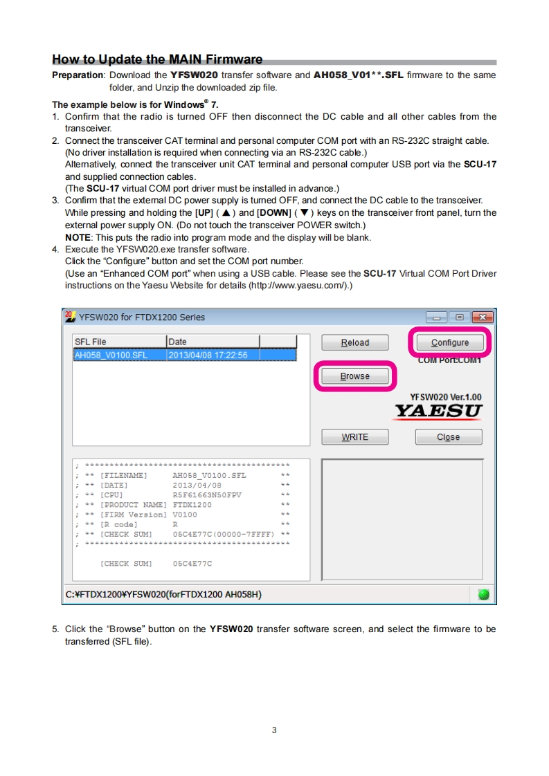 YAESUFTDX1200The radioFirmware Update ManualThis programming software will install and run on a personal computer.It may be used to update the firmwareof the FTDx1200 transceiver when connected to the personal computer.ImportantBefore downloading this software,please read the "Important Notes"carefully.Downloading or installing this software will indicate your acceptance and agreement with the contents of the"Important Notes"'Transceiver"is used hereafter to refer to the FTDx1200 transceiver.Important NotesAll responsibility for the use of this software lies with the customer.Yaesu cannot be held responsible inany way for damage or loss which may be incurred as a result of using this software.Copyrights and all other intellectual property rights for the software,as well as the software manual,arethe property of YAESU MUSEN CO.,LTD.The revision,modification,reverse engineering,or decompiling of this software is prohibited.Redistribution,transfer,or resale of downloaded files is also prohibited.This software is for individual personal use only.If you cannot perform the firmware update yourself.please consult with one of our sales sites or service centers.System Requirements(Operating Environment)Supported Operating Systems·Microsoft®Nindows8.1·Microsoft Windows8·Microsoft Windows®7Microsoft Windows VistaTM(Service Pack 1 or later)x To update the TFT Firmware on your FTDx1200,you must first install "Microsoft .NET Framework 3.5"ontothe personal computer before beginning the firmware update process.CPUCPU which satisfies OS(operating system)requirementsRAM(System Memory)Sufficient RAM(system memory)to meet or exceed the OS (operating system)requirementsHDD(Hard Disk)A HDD(hard disk)with capacity to meet or exceed the OS (operating system)requirementsIn addition to having sufficient free space on the HDD for the OS to operate,the program requires 20 Mbyteor more of free space.PortsAn RS-232C interface(COM port)or USB port(USB1.1/USB2.0)Caution:Complete the "virtual COM pot driver installation before connecting the SCU-17 to the computerConnecting the transceiver to the computer via the USB cable before installation has beencompleted may result in the wrong driver being installed,and prevent proper operation.USB Driver(for Performing Version Updates via the USB Port)Requires SCU-17 (optional)in order to connect to the USB port.Install the virtual COM port driver on the personal computer before beginning the firmware upgrade process.Please see the SCU-17 USB Driver (Virtual COM Port Driver)files and instructions on the Yaesu Website fordetails(http://www.yaesu.com/).CablesRS-232C straight cable"or USB cable(AB type).Please have a commercially available cable ready.