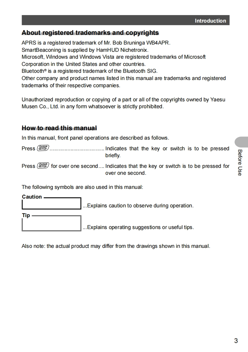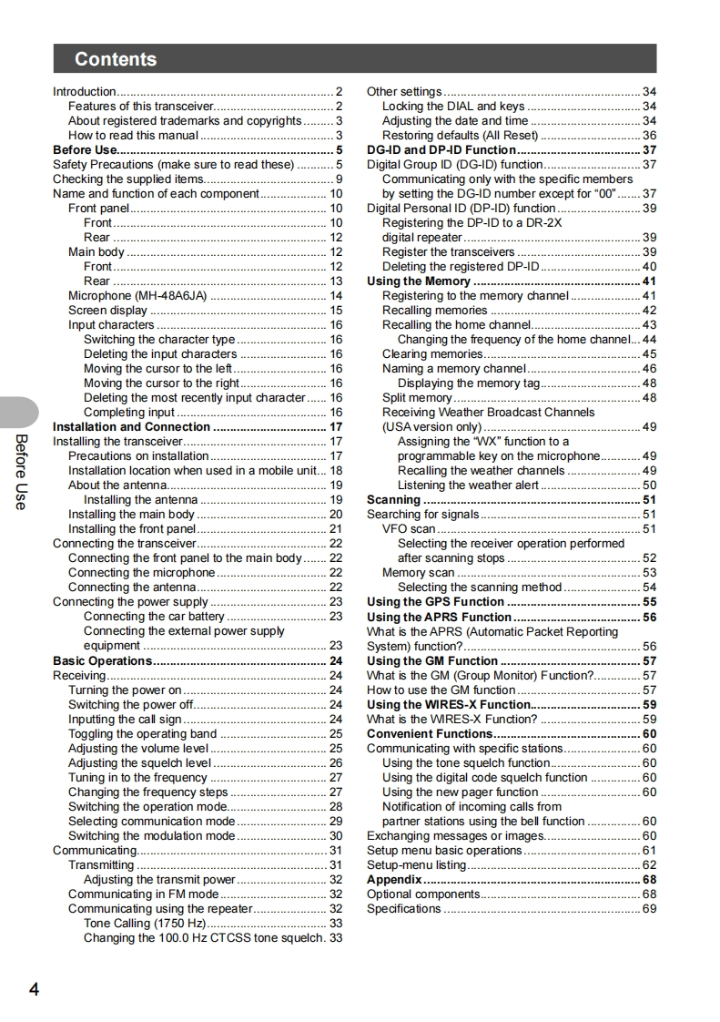 YAESUThe radioFTM-100DR/DEOperating Manual144/430MHzDUAL BAND TRANSCEIVERC4FM/FMBefore UseInstallation and ConnectionBasic OperationsDG-ID and DP-ID FunctionUsing the MemoryScanningUsing the GPS FunctionUsing the APRS Function5面米日146.52042 km/h日446.500园Using the GM FunctionmgCw@四四Using the WIRES-X FunctionConvenient FunctionsCustomizing Menu Settings andUser PreferencesAppendix